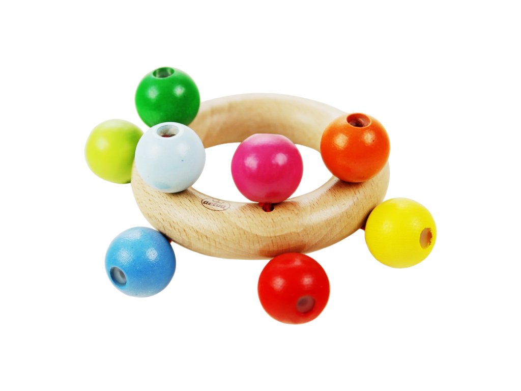 Dřevěné lehké chrastítko s barevnými kuličkami na sňůrce. Hlavní vlastnosti: pomáhá rozvíjet jemnou motoriku rukouvhodné pro děti od 6ti měsícůvýrobek splňuje požadavky EU na bezpečnost hračekprůměr kroužku je 7 cm a je připevněn na papírové kartě