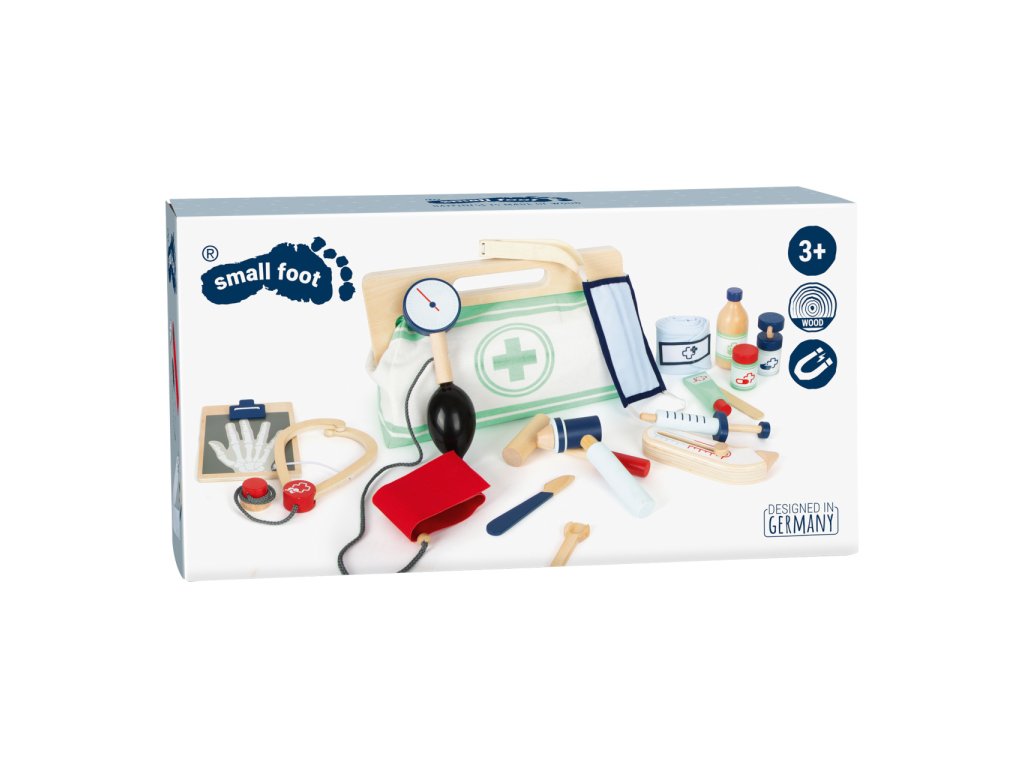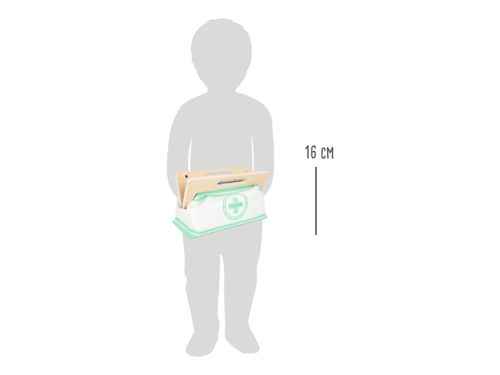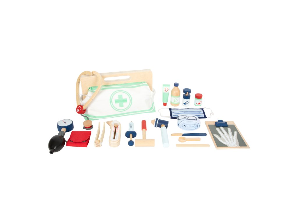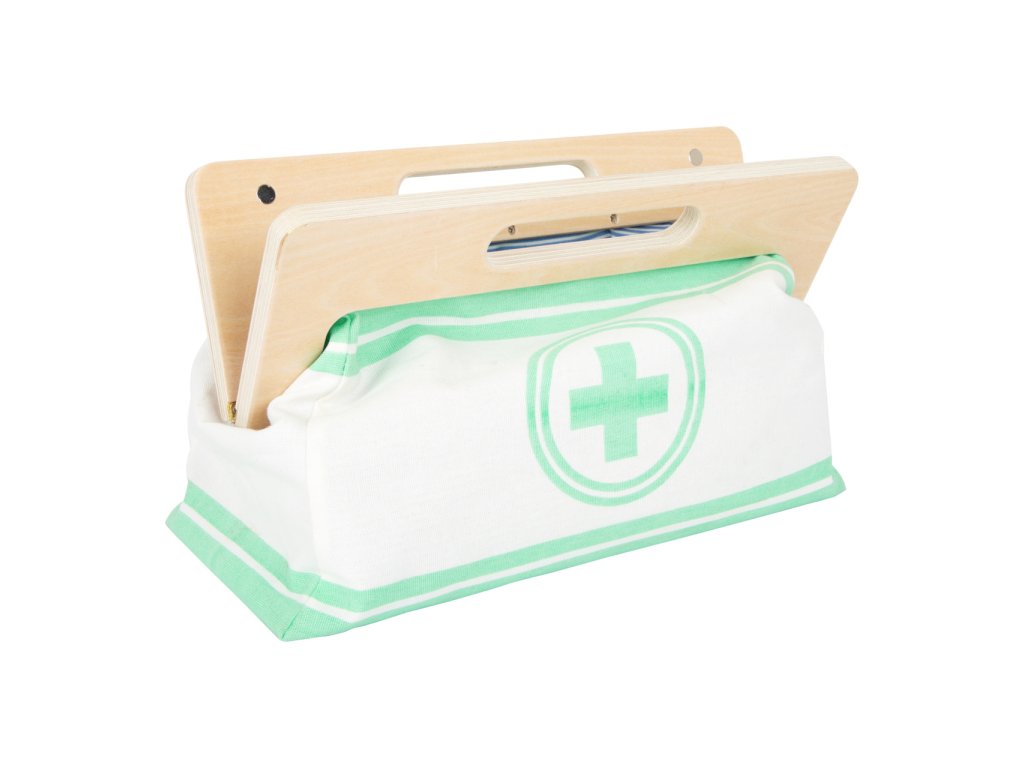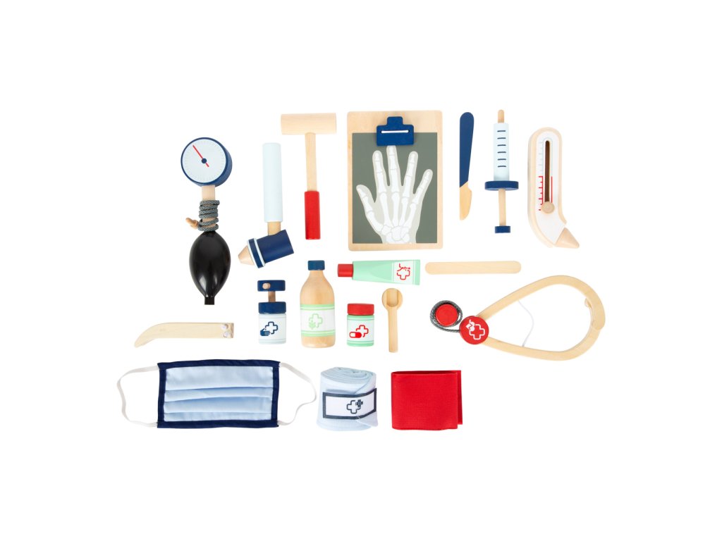 S touto standardní lékařskou brašnou budou mladí nadějní lékaři perfektně vybaveni. Brašna je vyrobená z měkkého textilu, je pěkná na pohled a také velmi funkční. Lze lehce otevřít díky magnetům, je vyrobena ze dřeva. Uvnitř brašny najdete všechno vybavení pro představivé ošetření pacientů: stetoskop, teploměr, stříkačku a mnoho dalšího – vše vyrobeno z pevného dřeva! Nejlepšími doplňky jsou zřejmě tlakoměr s manžetou a balónkem a otoskop s lupou. Tento obsáhlý set lékařských hraček obsahuje mnoho „opravdových“ lékařských nástrojů a přístrojů, s kterými si děti opravdu vyhrají. Ilustrace na lékařských pomůckách dětem poradí rozeznat nástroje a také jim možná zjednoduší jejich použití. Hlavní vlastnosti: Doktorská brašna s jasně viditelným dřevemTlakoměr s manžetou a balónkemTeploměr s nastavitelnou teplotouOtoskop s opravdovou lupouLahvička na léky se šroubovatelným víčkemNáplasti na suchý zipZnovu použitelné a pratelné dětské textilní rouškyDalší vybavení: injekční stříkačka s pohyblivým mechanismem, stetoskop, dezinfekce s pumpičkou, lahvička s léky a lžička, pinzeta, skalpel, reflexní kladivo