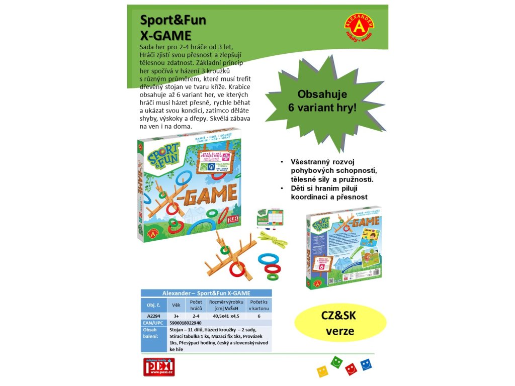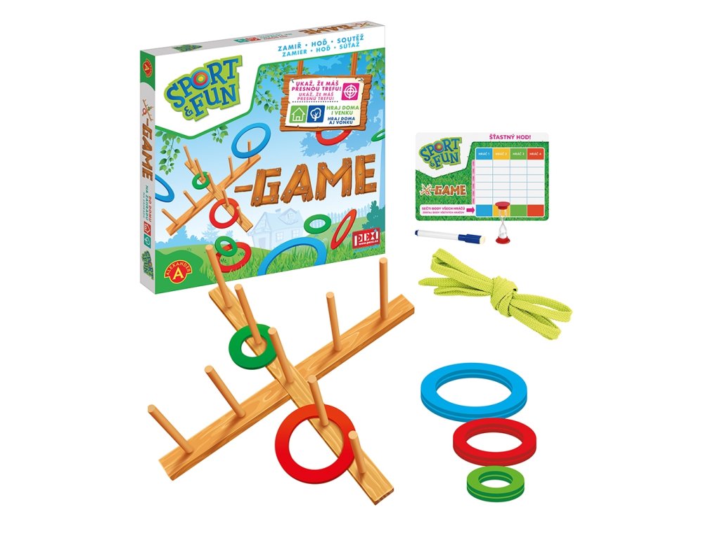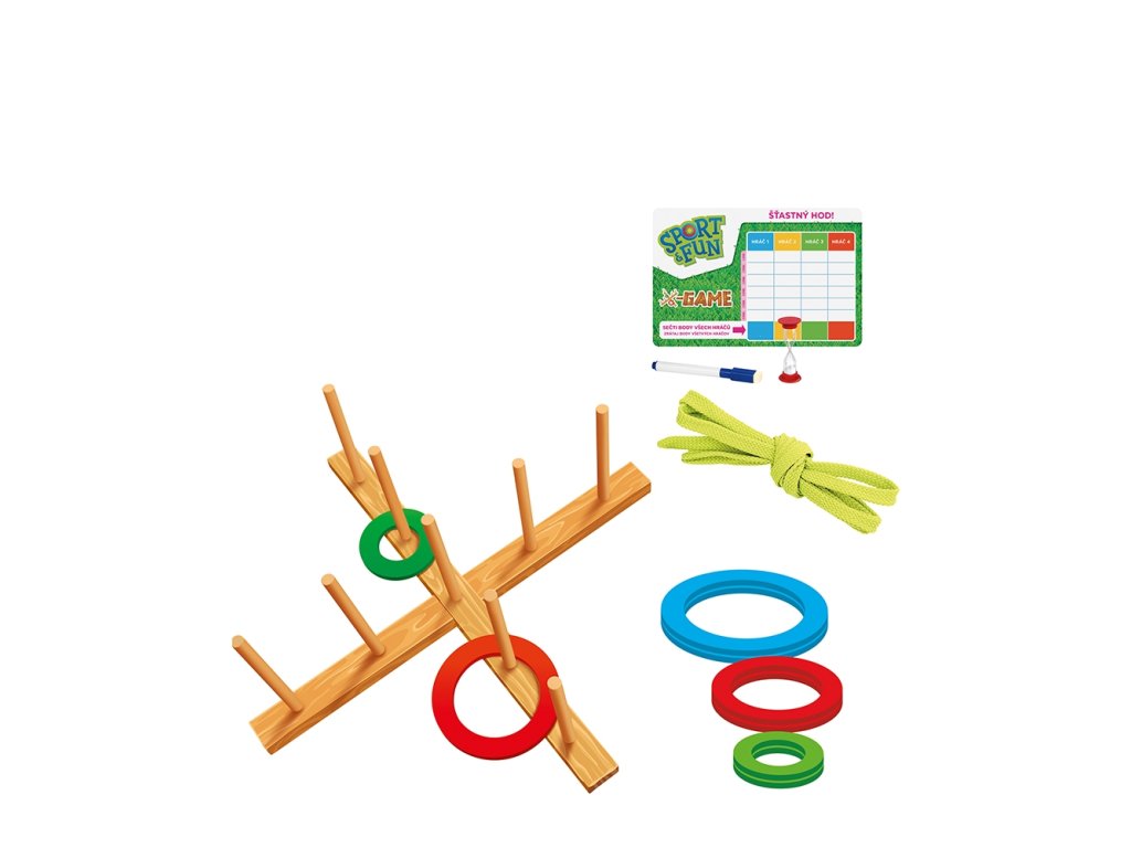 Série Sport&Fun od PEXI se stala Hračkou roku 2020 v ČR v kategorii OUTDOOR! Pohybová hra pro 2-4 hráče od 3 do 12 let, ve které zjistíš svou přesnost a zlepšuješ tělesnou zdatnost. Vyzkoušej všech 6 super variant her, ve kterých musíte nejen házet přesně, ale také rychle běhat a ukázat svou kondici, zatímco děláte shyby, výskoky a dřepy. Můžete si také zahrát variantu "pohybové casino". Skvělá zábava ven i domů. Sportovní hry a aktivity, ve kterých poznáš svou přesnost a zlepšuješ tělesnou zdatnost. Základní princip her spočívá v házení 3 kroužků s různým průměrem, které musí trefit dřevěný stojan ve tvaru kříže. Počet získaných bodů závisí jak na velikosti kroužku, tak na místě na stojanu, které jsi zasáhl.Krabice obsahuje až 6 variant her, ve kterých musíte nejen házet přesně, ale také rychle běhat a ukázat svou kondici, zatímco děláte shyby, výskoky a dřepy; nebo si můžete vyzkoušet pohybové casino. Stejně jako všechny hry ze série SPORT & FUN, poskytuje nejen skvělou rodinu mezi přáteli a rodinou, ale také posiluje naši fyzickou kondici a pomáhá vytvářet zdravé návyky. Obsah balení: stojan - 11 dílůházecí kroužky - 2 sadystírací tabulka - 1 ksmazací fix - 1 ksprovázek - 1 kspřesýpací hodiny - 1 ksčeský a slovenský návod Hlavní vlastnosti: posiluje fyzickou kondici pro malé i velkévhodné na doma i na zahradu nebo k vodě6 variant hry s různými úkoly