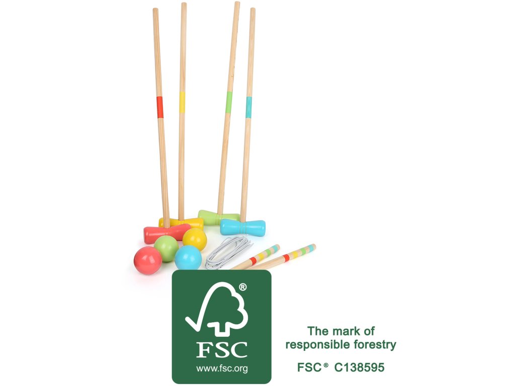 Klasická hra na zahradu. Venkovní hra ze 100% certifikovaného dřeva FSC® je skvělou zábavou pro celou rodinu. Branky lze zaseknout do trávy s většími nebo menšími rozestupy a v různých formacích, takže vytvoříte různé úrovně obtížnosti. Dřevěné kuličky musí projít všemi brankami. Hlavní vlastnosti: rozvíjí motoriku a koordinaci pohybů dětípodporuje zdravou soutěživostvyrobeno z 100% FSC dřeva Značka a certifikát FSC® (Forest Stewardship Council) zaručuje, že dřevo, ze kterého byl produkt vyroben, nebylo vytěženo nelegálně a pochází z lesů obhospodařovaných šetrným či přírodě blízkým způsobem, ve kterém jsou dodržovány přísné environmentální a sociální požadavky. Značka FSC® na výrobku znamená, že svým nákupem pomáháte chránit lesy a podporujete šetrné, odpovědné či přírodě blízké hospodaření, díky kterému jsou naše lesy stabilnější, zdravější, mají přirozenou druhovou skladbu a lépe odolávají negativním následkům klimatických změn.