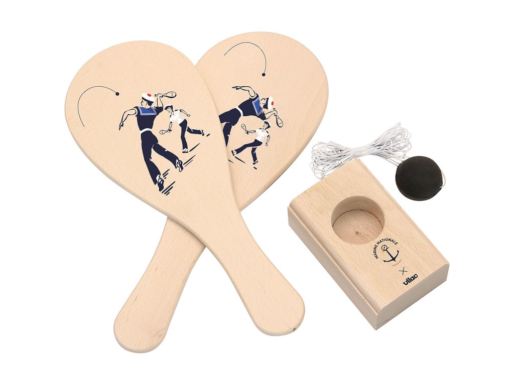 Klasická francouzská hra pro 2 hráče. Obsahuje 2 pálky a dřevěný podstavec s dlouhou elastickou šňůrkou, na jejímž konci je míček. Hráči se střídají v odpalech, snaží se míček udržet ve vzduchu. Pálky jsou 38 cm dlouhé. Hlavní vlastnosti: délka pálky 38 cmpodporuje pohybovou aktivituvyrobeno ve Francii Šťastnou plavbu! To je přání námořníkům, kteří vyráží na moře. Toto přeje i Vilac, se svou kolekcí, kterou vyvinuli ve spolupráci s francouzským námořnictvem. Vůni moře vítr dofoukal až do pohoří Jura, výsledek jistě potěší malé námořníky a námořnice, také dospělé, kteří pečují o své vnitřní dítě!
