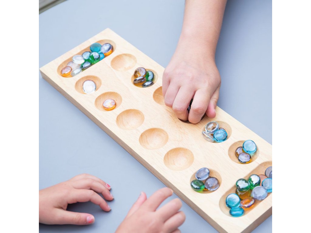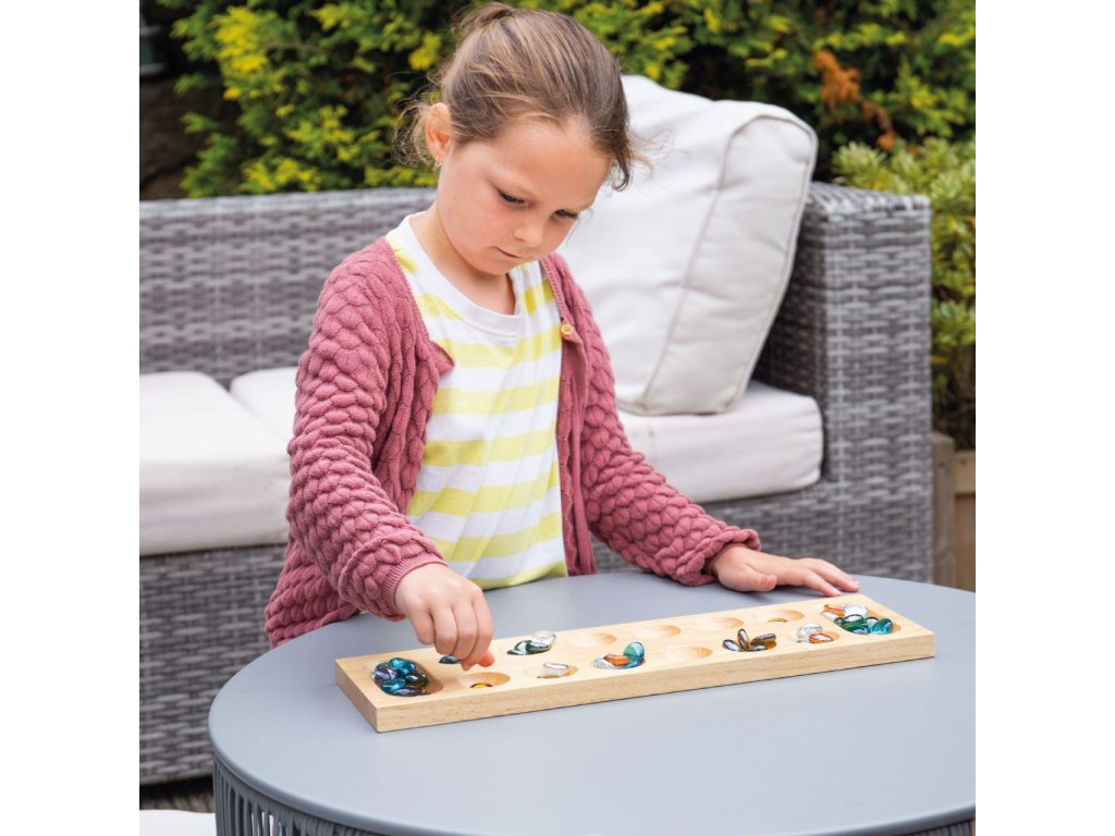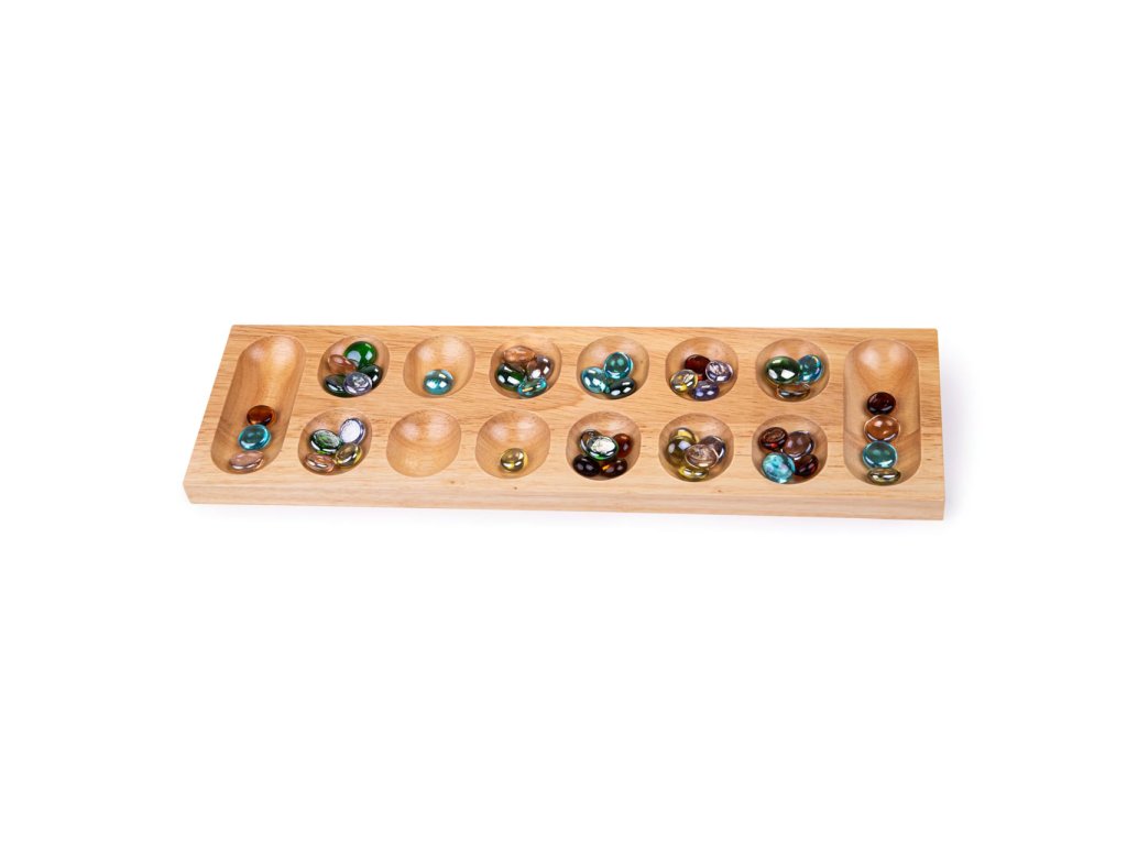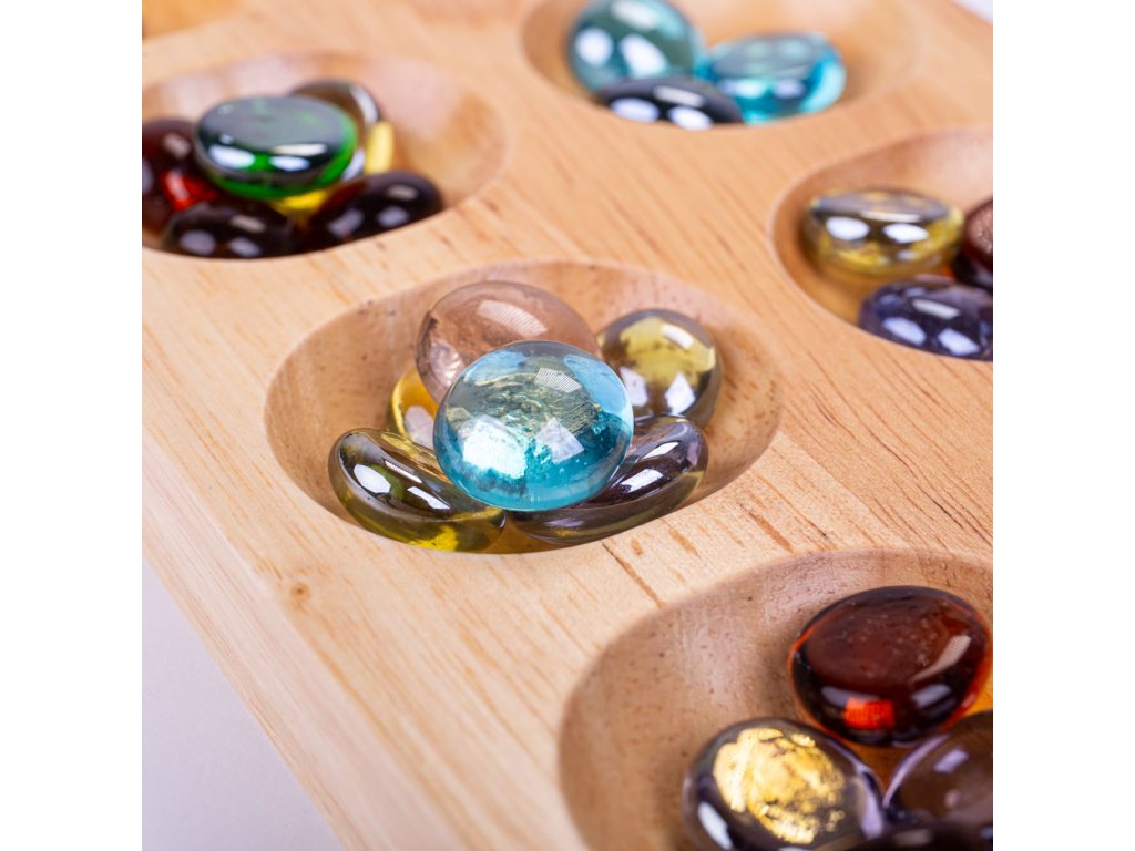 Objevte starobylé mankalové hry v atraktivním provedení s různobarevnými skleněnými kamínky. Rozvíjejte zábavnou a poutavou formou logiku i početní dovednosti. Hrací deska je vyrobena z kvalitního, zodpovědně získaného a pečlivě opracovaného masivního dřeva. Hlavní vlastnosti: hrací deska a 48 hracích kamenůpro 2 hráčeatraktivní barevné provedenírobustní a odolné zpracování Pravidla hry:Jednou z nejznámějších mankalových her je Kalaha. V jejím úvodu rovnoměrně rozdělíte všechny kamínky do šestice menších jamek a vylosujete si začínajícího hráče. Velká jamka po pravici každého z hráčů je jeho pokladnicí, do níž se bude snažit postupně přemístit co největší počet kamenů. To se děje tak, že táhnoucí hráč vybere obsah některé jamky na své straně hracího pole a po jednom kamínku, proti směru hodinových ručiček, hrst rozděluje do po sobě jdoucích jamek. Jako jamka se v té chvíli počítá i jeho pokladnice, nikoli však soupeřova. Pokud poslední kamínek v aktuálním tahu vychází na hráčovu pokladnici, získává právě hrající tah navíc. Připadne-li poslední kamínek na prázdnou jamku hracího pole blíže rozdávajícímu, může jej hráč přemístit do své pokladnice, navíc ale získává i kameny z jamky na protilehlé, soupeřově, straně. Jakmile v jamkách na jedné, či druhé straně nezůstane žádný kámen, hra končí. Hráč, kterému po skončení zbyly v jamkách na jeho straně nějaké kameny, je může připočíst k obsahu své pokladnice.