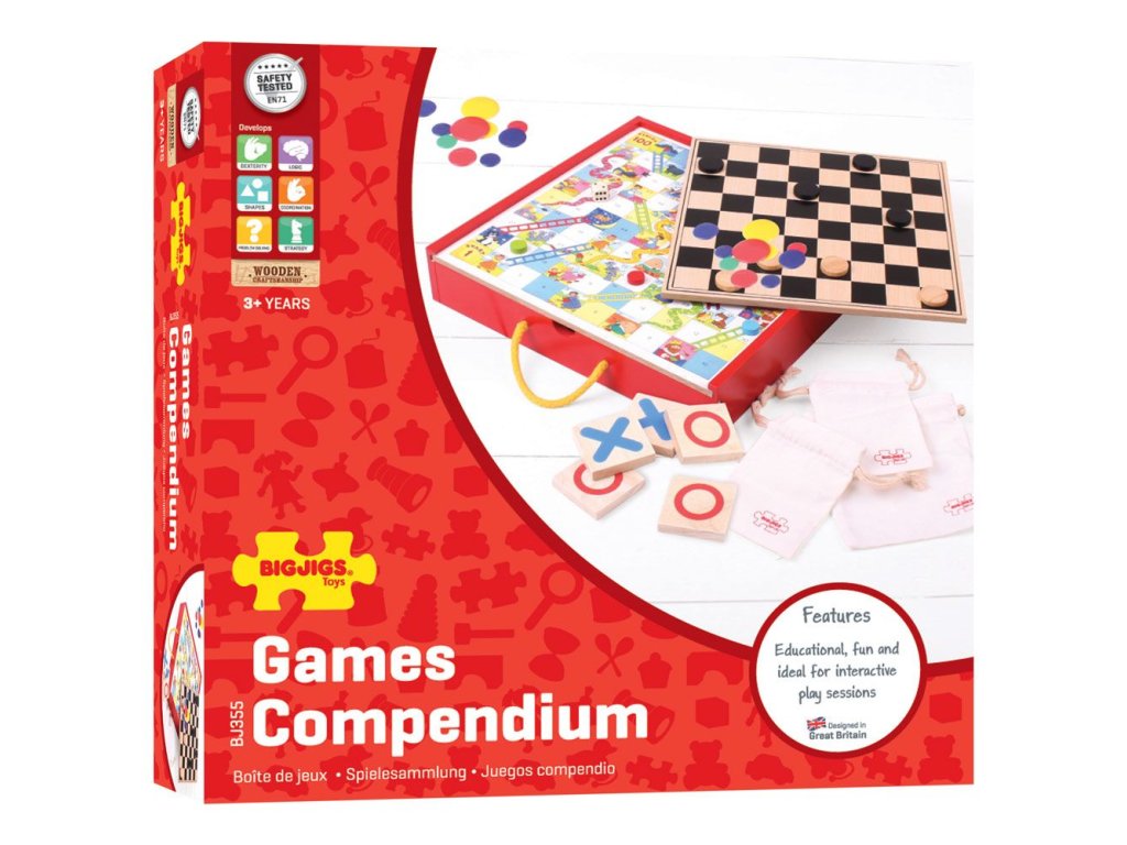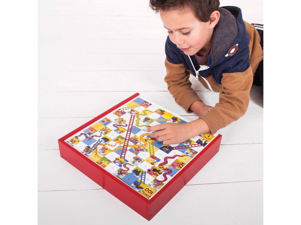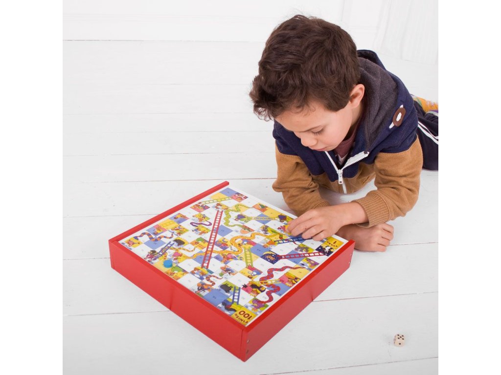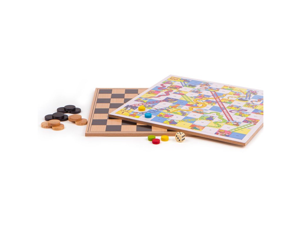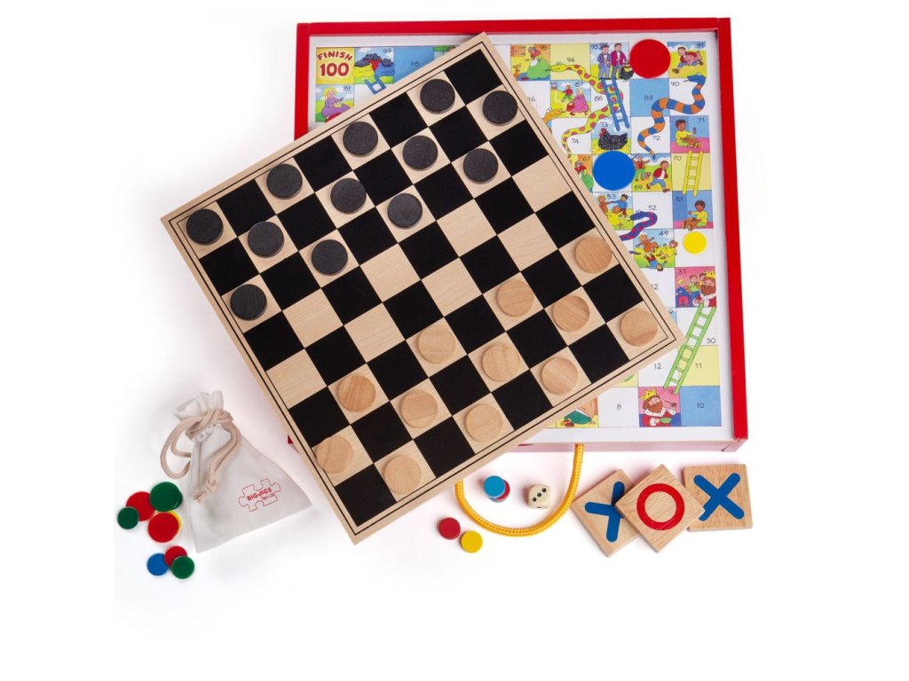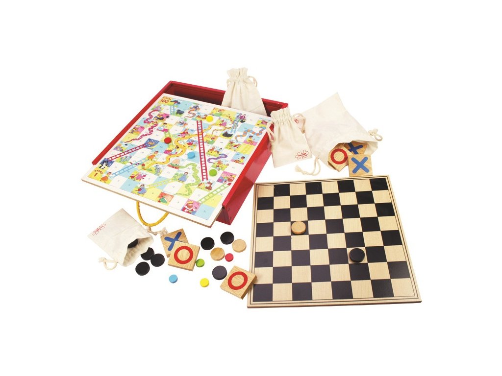 Soubor her v dřevěném boxu obsahuje hrací prvky a instrukce pro nejméně čtyři klasické stolní hry jako jsou například hadi a žebříky, piškvorky nebo dáma. Dřevěná krabička má posuvné víko s oboustrannou deskou a držadlem pro nošení, aby se z ní stala ideální cestovní hračka. Vzdělávací i zábavné pro interaktivní hry. Vyrobeno z vysoce kvalitních, odpovědně získaných materiálů. Odpovídá současným evropským bezpečnostním normám. Hlavní vlastnosti: praktická krabička s posuvným víkem a madlemobsahuje tradiční hry jako hadi a žebříky, piškvorky či dámapodporuje logické myšlení a trpělivost
