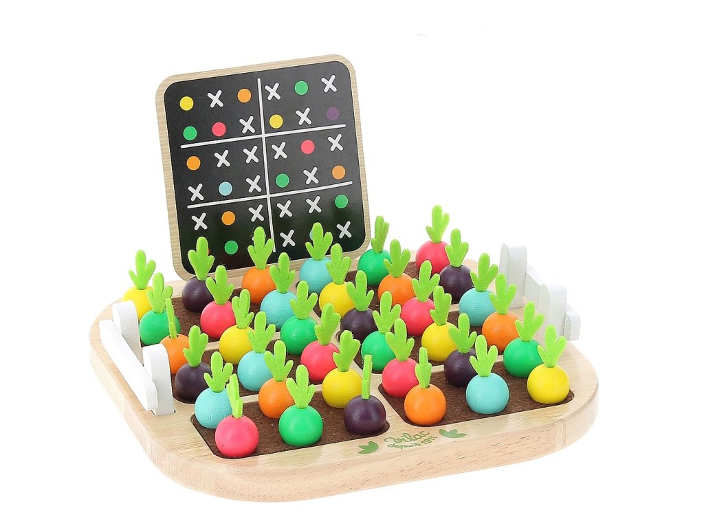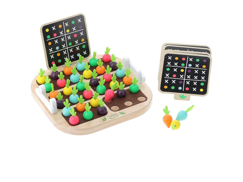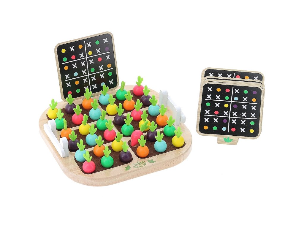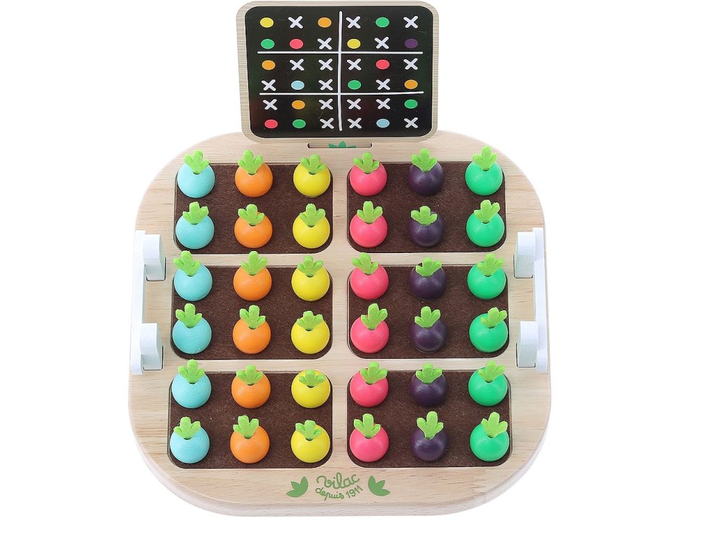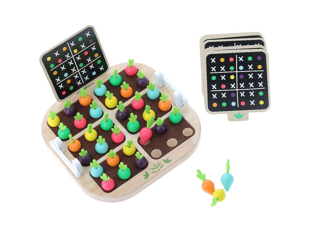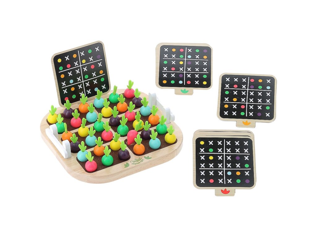 Zeleninové sudoku pro nejmenší! Cíl hry je jednoduchý – musíte umístit dřevěnou zeleninu do zahrádky dle jedné z kartiček, poté dle pravidel sudoku vyplnit prázdná políčka. V jednom čtverci, řádku a sloupci se nesmí opakovat stejná barva. Zábavná a barevná hra pro lidi všeho věku! Hlavní vlastnosti: atraktivní barevné provedeníhra pro všechny věkové kategoriepomáhá rozvíjet logické myšlení a soustředěnost dětírám zajišťuje stabilitu