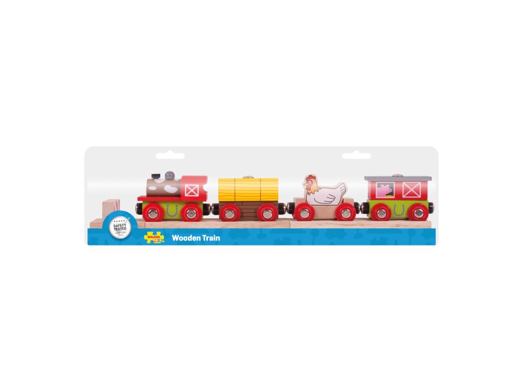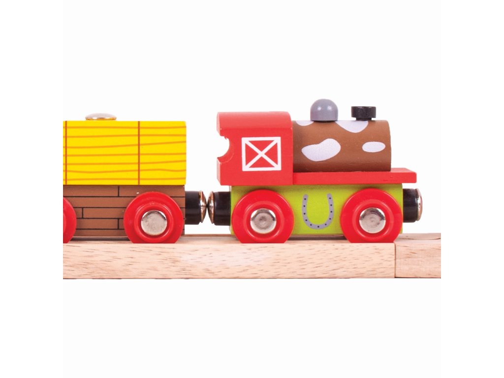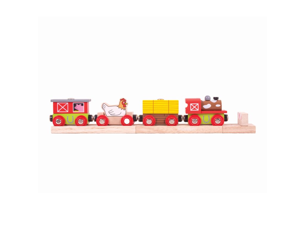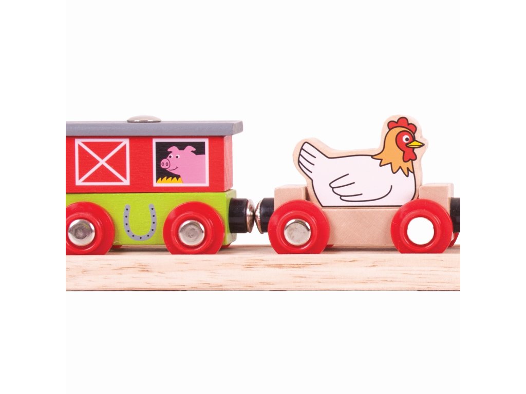 Součásti balení jsou také koleje: 2ks střední kolej BJT101 a 1ks koncová kolej BJT161!Děti budou milovat tento jasný a veselý set vlaku farma, který zahrnuje tři vagónky, kolejnice a chytrou lokomotivu. Magnetická spojka vagónků také znamená, že mohou být snadno propojeny s dalšími kusy. Hlavní vlastnosti: vláčkodráhy a jejich příslušenství značky Bigjigs Rail je možno kombinovat se všemi dalšími dřevěnými vláčkodráhami na trhuvyrobeno z kvalitních a zodpovědně získaných přírodních materiálůodpovídá současným evropským bezpečnostním normámpodporuje představivost, obratnost a koordinaci