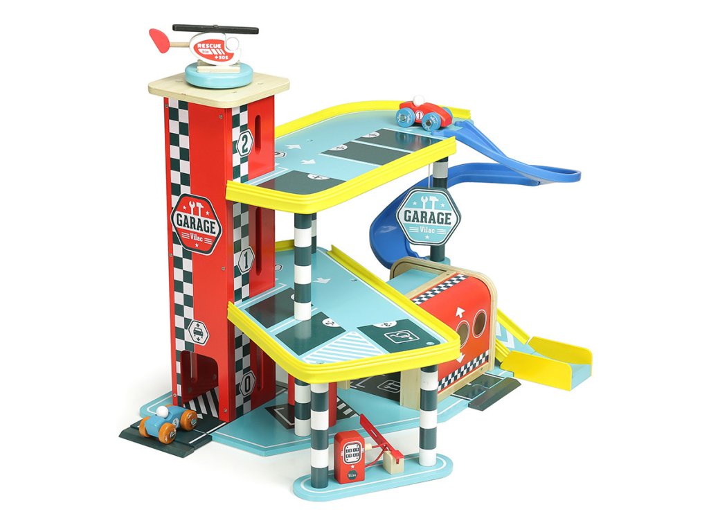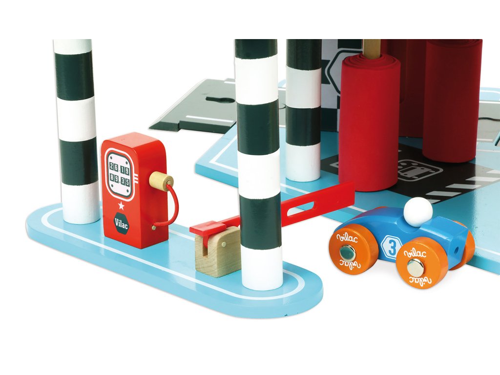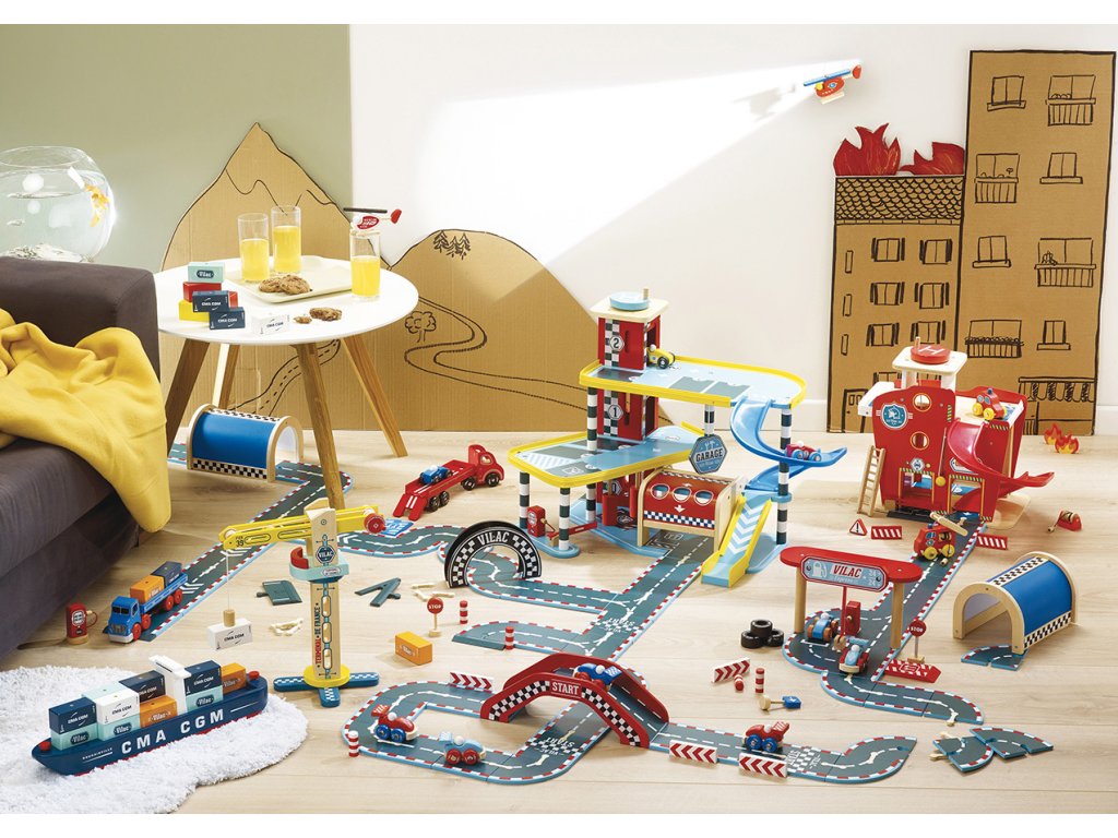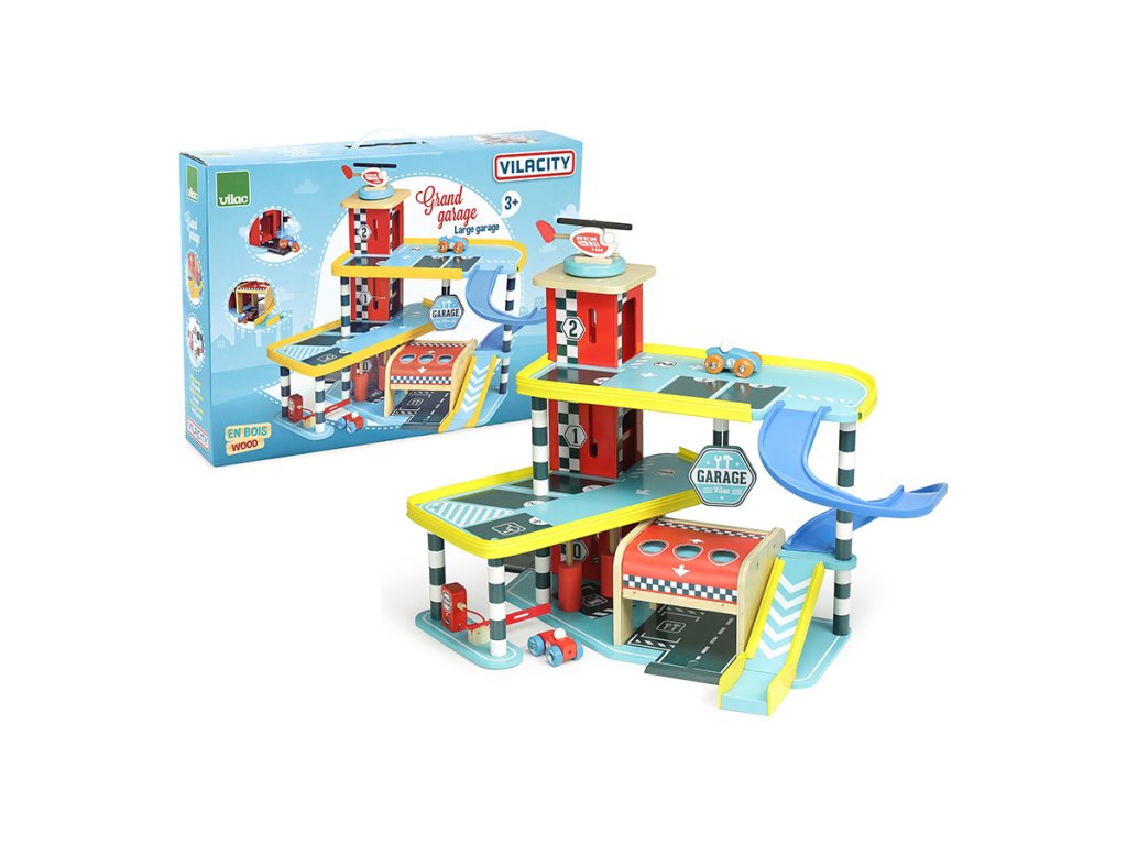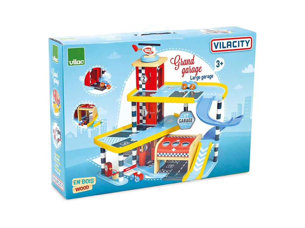 Velká garáž s rampou, která nabízí množství mechanických detailů, zejména výtah, zatahovací dveře, parkovací závoru, ale i čerpací stojan, či mycí kartáče. Její součástí je také dvojice autíček a helikoptéra. Garáž je součástí Vilacity kolekce a je se všemi jejími součástmi plně kompatibilní, další samostatná rozšíření přinesou variabilitu a prohloubí zážitek ze hry. Výrobek vyžaduje montáž, dodáváno s detailním návodem k sestavení. Hlavní vlastnosti:garáž, 2 autíčka a helikoptéravýtah, zatahovací dveře, závora, čerpací stojan a mycí kartáčekompatibilní se všemi součástmi Vilac Vilacity kolekcevyrobeno ekologicky, šetrně k prostředí V2354 – Velký závod Vilacity (není součástí sady, najdete v naší nabídce): Příklad sestavy garáže s dalšími součástmi kolekce Vilacity: