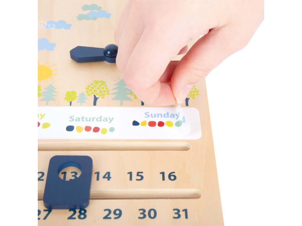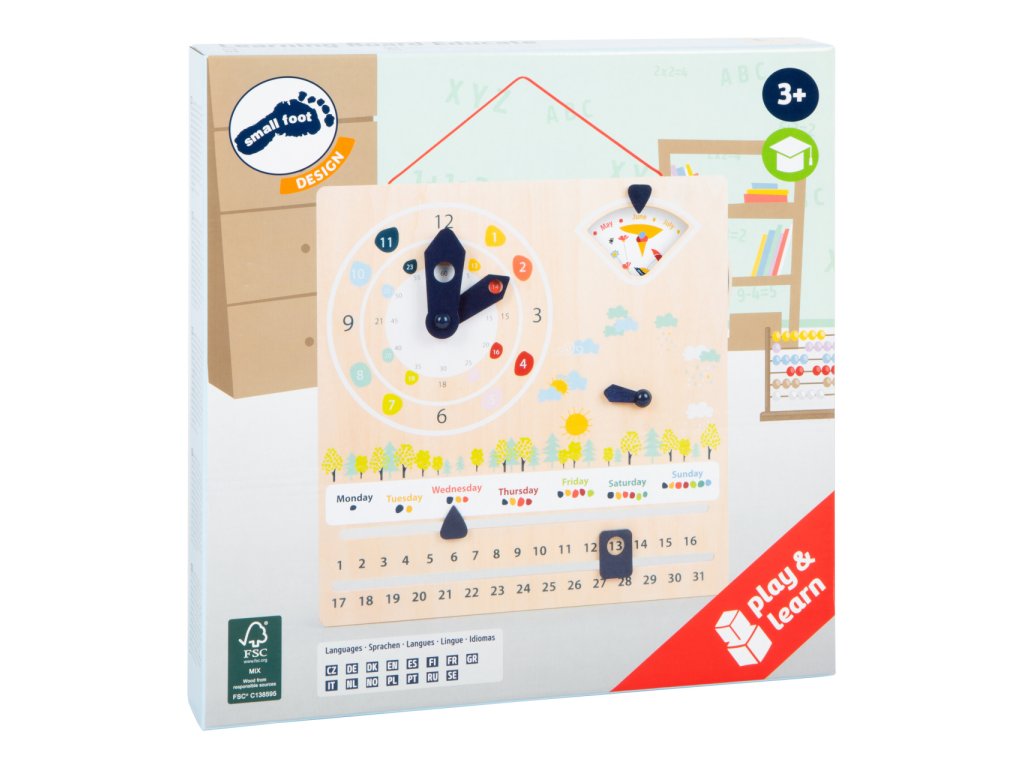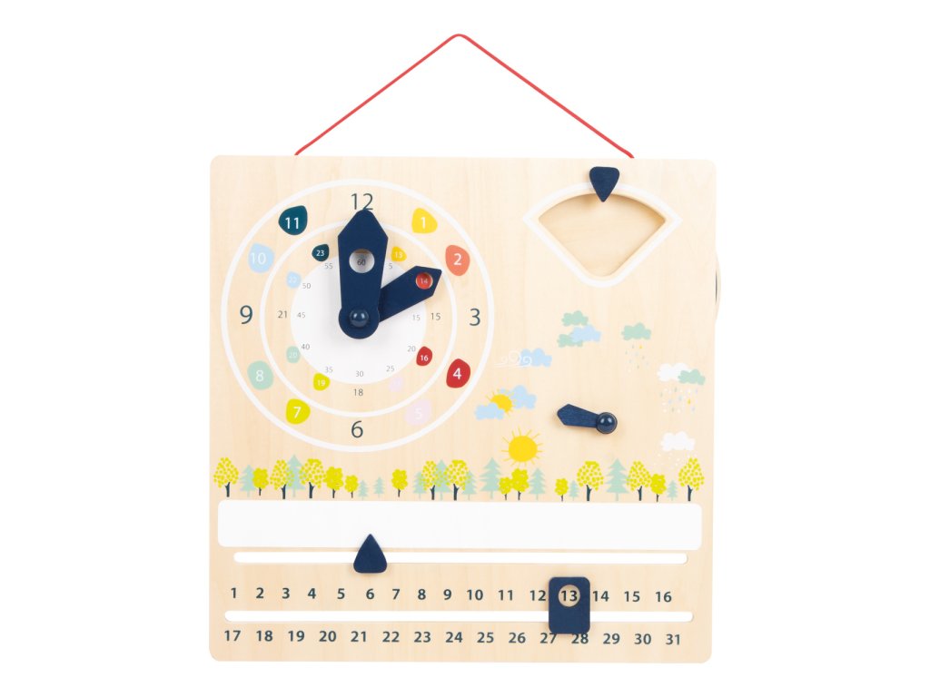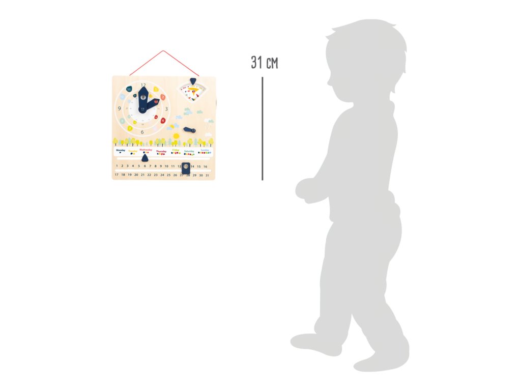 Podporují děti v učení se času ve 12 a 24 hodinovém systému. Současně zprostředkovávají znalosti o počasí, dnech v týdnu, měsících a ročních obdobích hravým způsobem pomocí jednoduchých ilustrací. Při nastavování ručiček jsou současně trénovány motorické dovednosti. Se závěsným zařízením a nálepkami, pro použití v 15 evropských jazycích: CZ, DE, DK, EN, ES, FI, FR, GR, IT, NL, NO, PL, PT, RU, SE. Hlavní vlastnosti: procvičuje motorické schopnostipoužití v 15 evropských jazycíchučí poznávat čas a datumvyrobeno z 100% FSC dřeva Značka a certifikát FSC® (Forest Stewardship Council) zaručuje, že dřevo, ze kterého byl produkt vyroben, nebylo vytěženo nelegálně a pochází z lesů obhospodařovaných šetrným či přírodě blízkým způsobem, ve kterém jsou dodržovány přísné environmentální a sociální požadavky. Značka FSC® na výrobku znamená, že svým nákupem pomáháte chránit lesy a podporujete šetrné, odpovědné či přírodě blízké hospodaření, díky kterému jsou naše lesy stabilnější, zdravější, mají přirozenou druhovou skladbu a lépe odolávají negativním následkům klimatických změn.