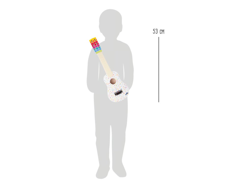 Tato kytara v bílé barvě s malými barevnými puntíky je nutnou výbavou pro všechny mladé milovníky hudby. Kytara je také nezbytnou součástí dětské kapely či herny. Může sloužit k naučení prvních akordů a citu pro rytmus. S pomocí malé kytary se mohou děti naučit doprovázet první říkanky a popěvky. Hlavní popis: děti se naučí akordy a hudební sluch