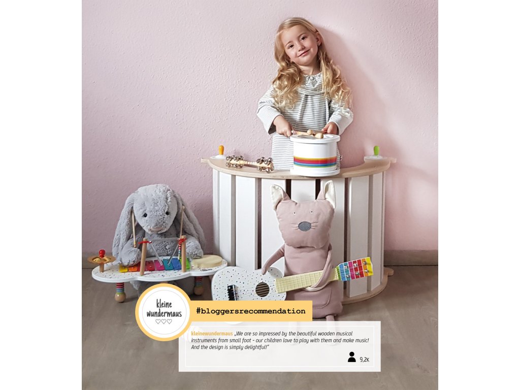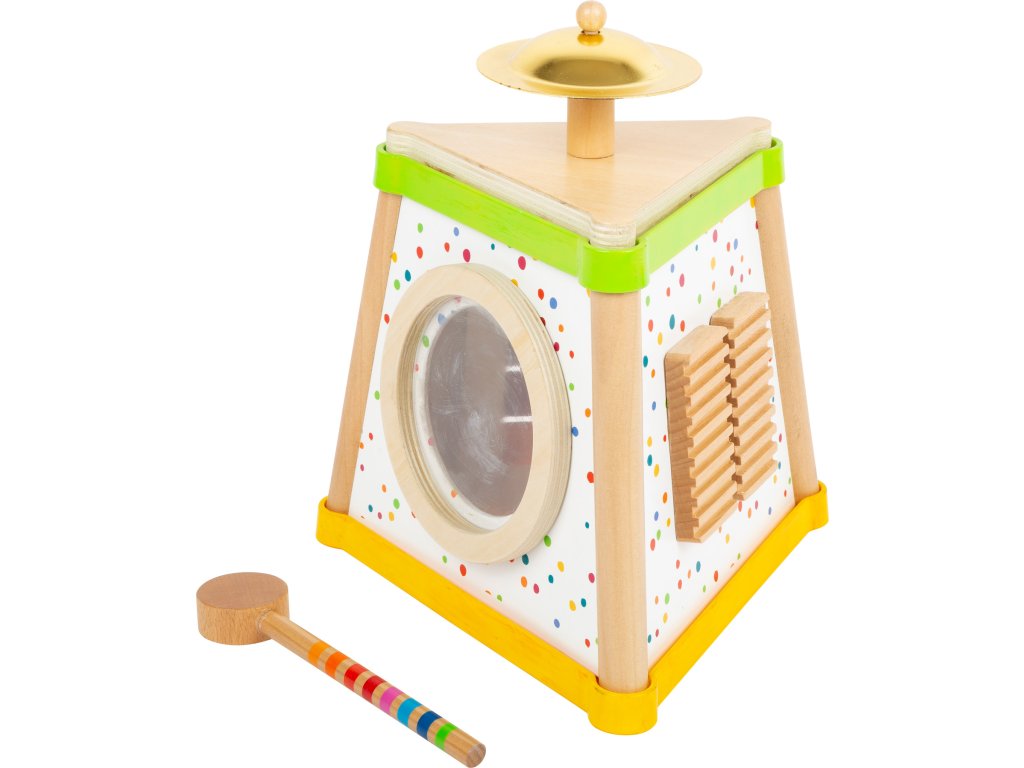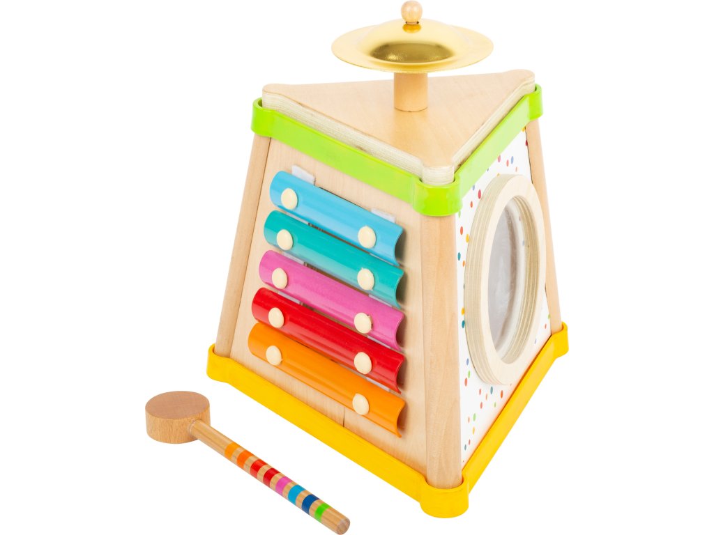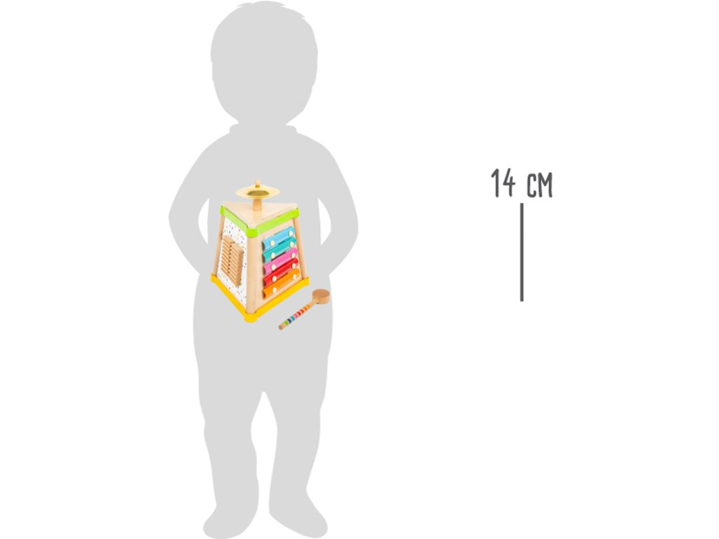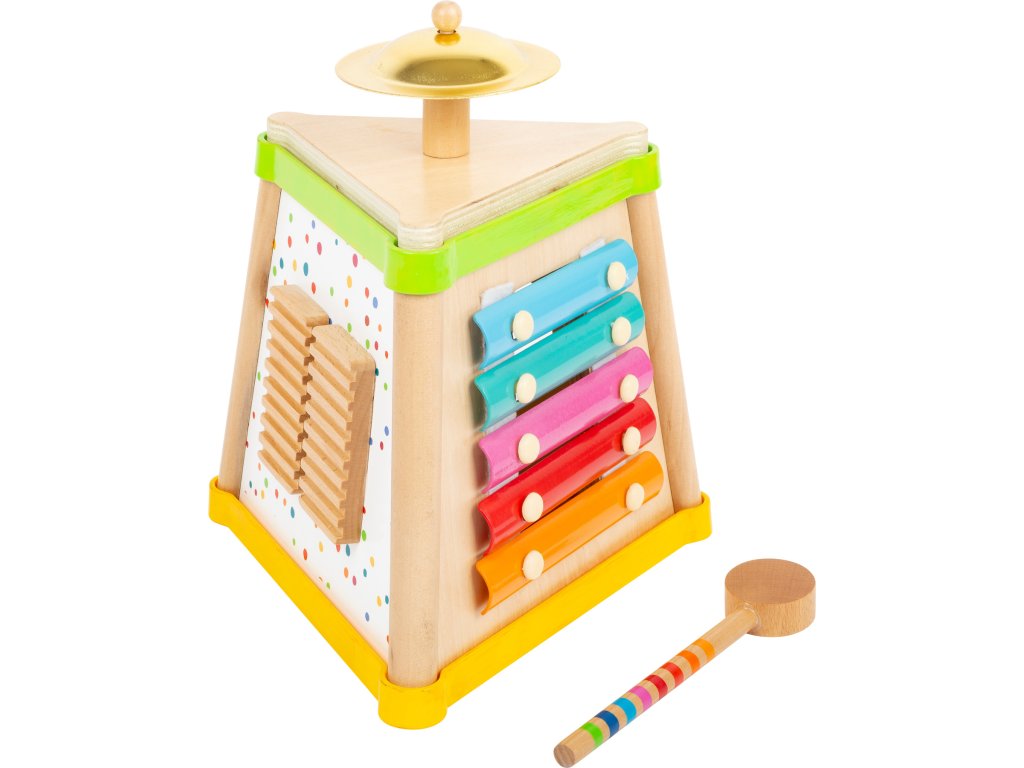 Hudba a tóny Vás zaručeně rozveselí! Tento pestrobarevný dřevěný komolý jehlan nabídne na svých třech stranách různé možnosti tvoření rytmických zvuků. Je zde chrastítko, mini xylofon a bubínek. Malý činel na vrcholku se rozezvučí zvonivým zvukem. Všestranná zvuková sada dává hudební show zelenou! Nejedná se o hudební nástroj, ale o hračku. Hlavní vlastnosti: 4 zvukové nástroje a paličkatrénuje sluch, jemnou motoriku a smysl pro rytmus