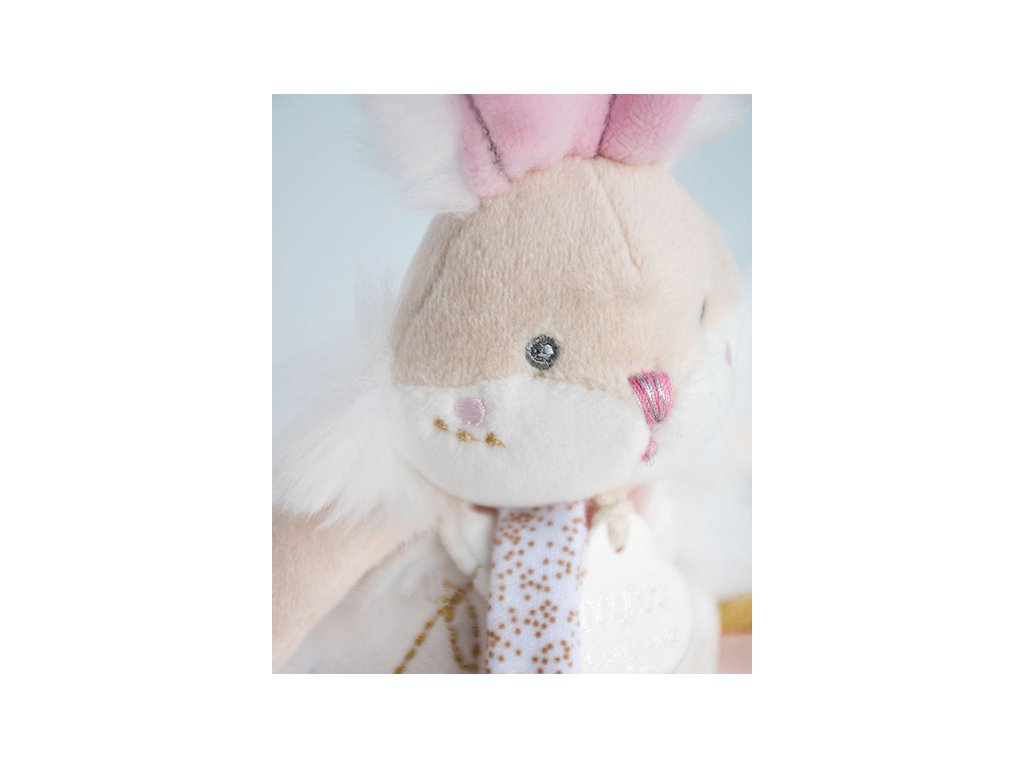 Něha, pastelové barvy a spousta rafinovanosti je tento králíček s chrastítkem a také držákem dudlíku. Doprovází miminko od narození, aby mu přinesl hebkost, pohodlí a také držel dudlík v jeho blízkosti. Rozvíjí smysly a zvědavost. Je to velmi pěkný dárek k Vánocům nebo k oslavě narození miminka. Je extrémně měkký a příjemný na dotek. Údržba: Perte v lázni na 30°. Přirozené nebo nízkoteplotní sušení. Hlavní vlastnosti: měkký plyš, prémiový materiálv souladu s evropskými normami CEhračka, chrastítko, držák dudlíkuvhodné od narození