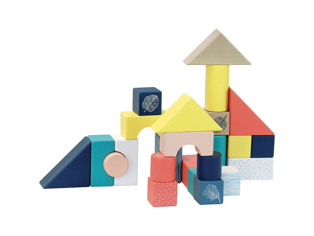 Dřevěný vozík s modrým madlem, bílou ilustrací a pogumovanými kolečky veze 24 kostek barevných i přírodních v různých tvarech. Děti podpoří při chůzi, hra s kostkami zase rozvine jejich prostorovou představivost. Vhodné od 12 měsíců. Hlavní vlastnosti: obsahuje 24 kostekmoderní barevný designvozíček a chodítko v jednompomáhá v rozvoji rovnováhy a motoriky dětí