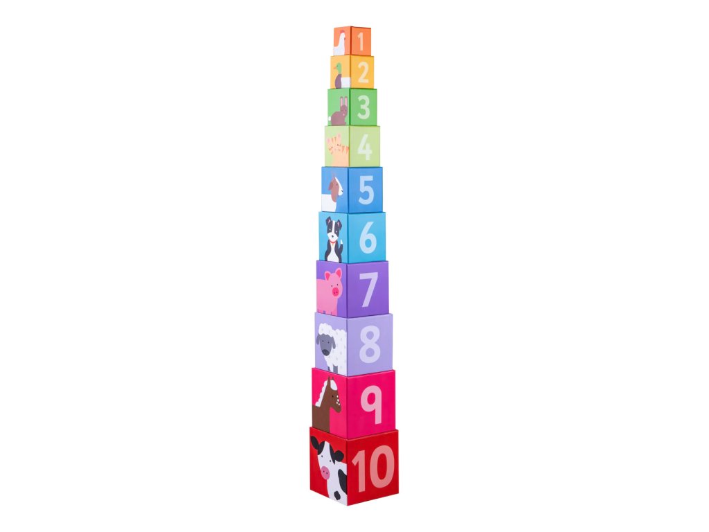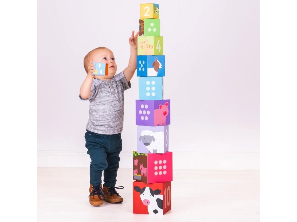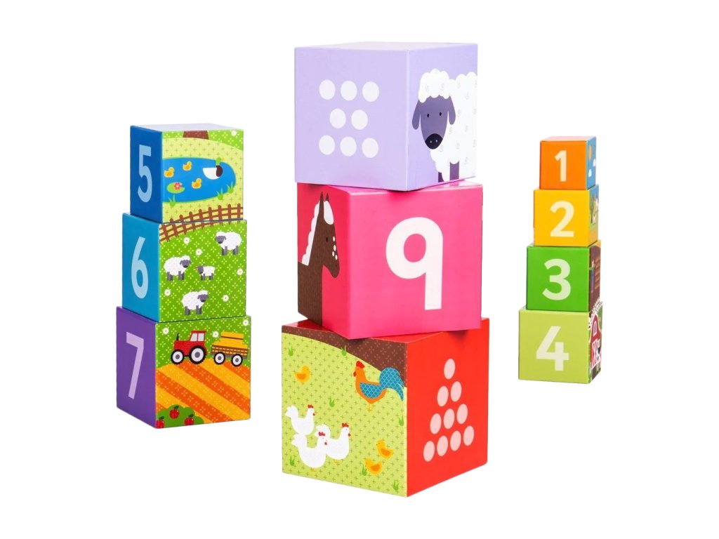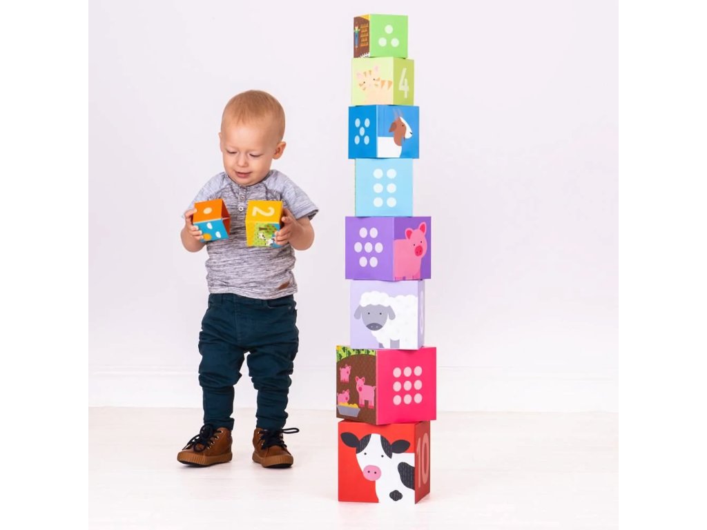 Abyste vytvořili věž, musíte tyto kostky naskládat od největší po nejmenší. Každá kostka obsahuje ilustraci z prostředí farmy, číslo a tečky, které představují dané číslo. Při skládání děti mohou diskutovat o farmě a rozšiřovat si tak slovní zásobu, také mohou počítat tečky a pak si svůj výsledek zkontrolovat dle čísla na opačné straně – naučí se počítat a poznávat čísla. Tyto kostky pomohou dětem s učením a podpoří je v brzkém počítání, čtení, poznávání barev a tvarů. Až si děti dohrají, mohou kostky naskládat na sebe, nezaberou tak moc úložného prostoru. Hlavní vlastnosti: rozvíjí koordinaci ruka-oko, jemnou motoriku a zručnostvyrobeno z kvalitních materiálů z odpovědných zdrojůodpovídá evropské bezbečnostní normě