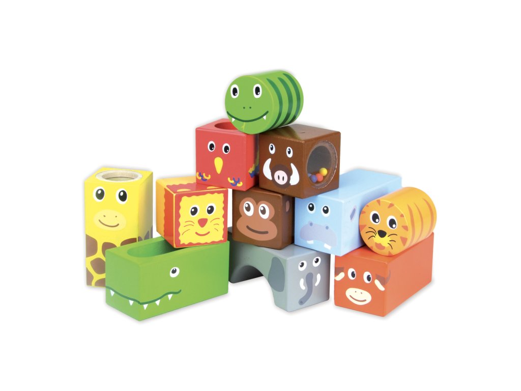 Jedenáct dřevěných zvukových kostek s motivem savany. S těmito kostkami si děti procvičí motoriku i zručnost a zároveň budou objevovat zvuky. Pro děti velmi poutavá hračka. Hlavní vlastnosti: edukativní senzorické kostky obsahuje 11 kostek