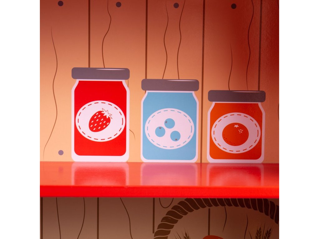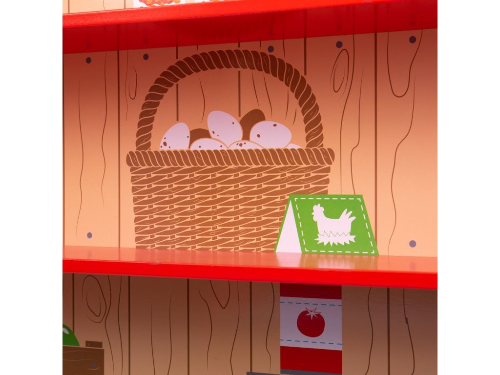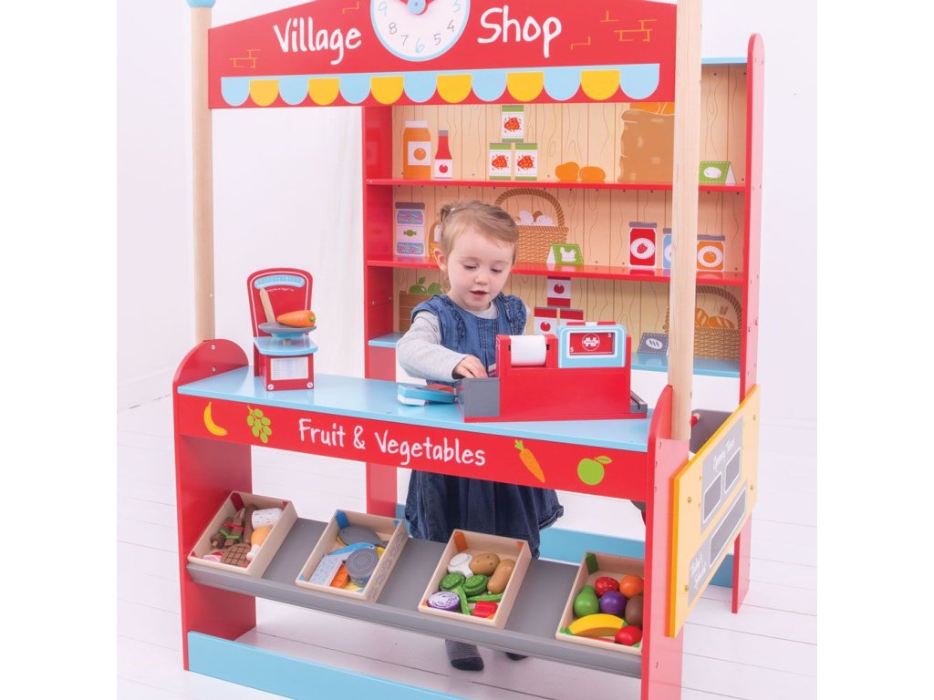 Vesnický obchod v pestrých barvách a životní velikosti je připraven k naplnění čerstvými produkty pro všechny zákazníky. Obsahuje tabuli na křídy, kde děti mohou napsat otevírací dobu a speciální nabídku, také hodiny s otočnými ručičkami. Pomozte dětem utvořit jejich sebevědomí při hře na prodavače či manažery obchodu. Potraviny, pokladna (BJ468) a váhy (BJ467) nejsou součástí balení. Obchod musí být po vybalení složen. Odpovídá současným evropským bezpečnostním normám. Hlavní vlastnosti: pestrobarevný obchod s tabulí a hodinami6x různě vysoké policeboční koš z plátnapodporuje kretivitu při hraní odpovídá současným evropským bezpečnostním normám