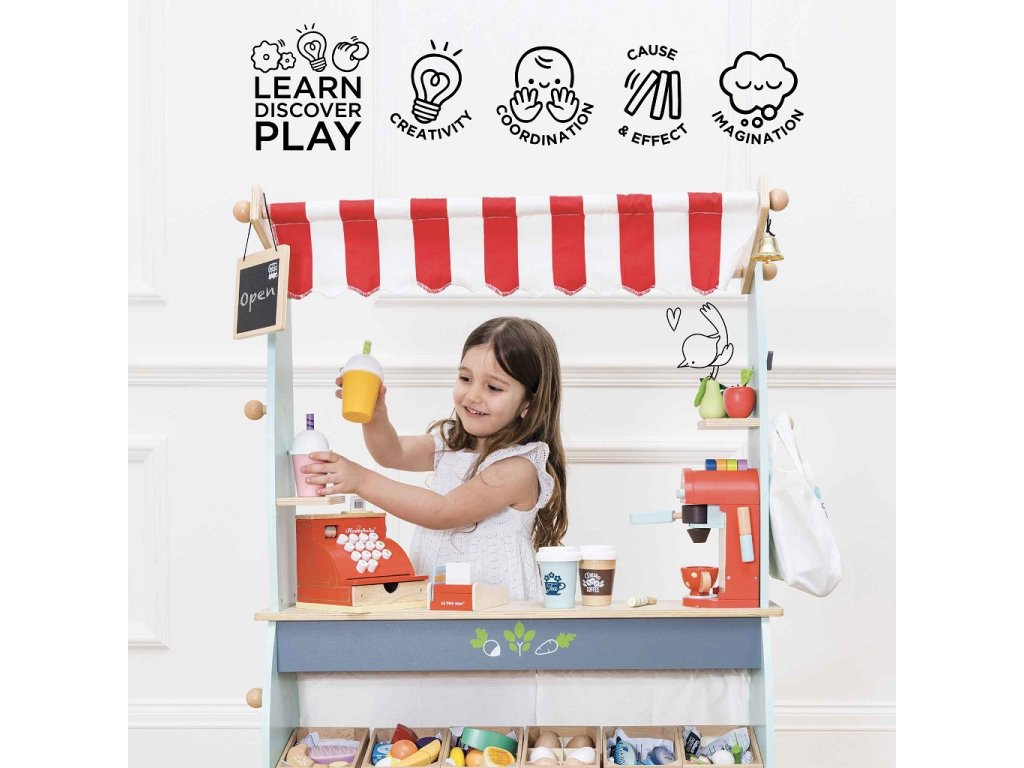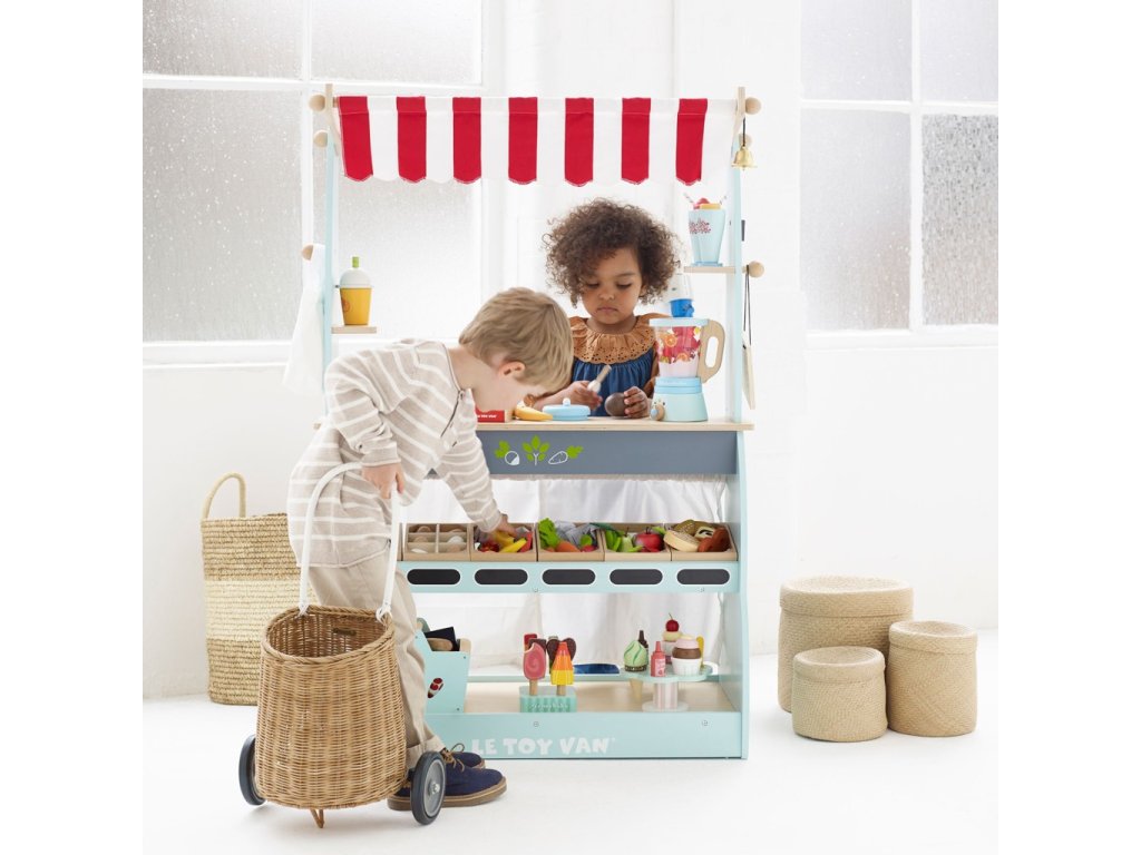 Skvělý a všemi oblíbený dřevěný prodejní pult vyhrál několik ocenění! Dětem poslouží jako obchod i kavárna, opravdu záleží jen na jejich představivosti. Pult 2 v 1 stačí otočit, na jedné straně má prodejní police, do kterých se vejdou bedýnky a produkty, na straně druhé prostor vhodný pro přípravu a servírování horkých nápojů. Nechybí ani oboustranná tabulka na křídu, textilní nákupní taška a zvoneček. Děti si při představivé hře procvičí nejen sociální dovednosti. Lze kombinovat s bedýnkami s jídlem od Le Toy Van. Hračky s účelemVšechny hračky firmy Le Toy Van jsou vyrobeny s cílem – aby dlouho vydržely. Designovány s láskou zkušenými řemeslníky za použití etických praktik a udržitelných materiálů, které jsou laskavější k naší planetě. Hlavní vlastnosti: vyrobeno eticky z udržitelného dřevatestováno dle nejpřísnějších standardůmalováno netoxickými barvami na bázi vodyinspiruje k představivé hřerozvíjí kognitivní dovednostikolečka pro jednoduchý transport Ocenění hračky:Junior Design Bronze Award 2017Good Toy Guide RecommendedRight Start Best Toy Award Winner 2017 Honeybake kolekce: Hračky v této kolekci jsou vhodné k objevování, pomohou dětem s rozvojem představivosti, sociálních a verbálních dovedností a kognitivních funkcí. Tradiční design s moderními detaily děti jistě bude bavit. Honeybake je kolekce Le Toy Van, která vyhrála nejvíce ocenění, a to za design, kvalitu, bezpečnost a také za vzdělávací a herní hodnotu.