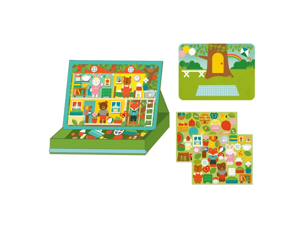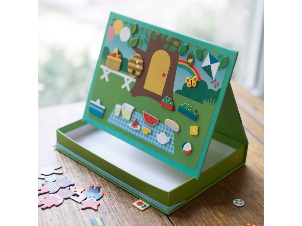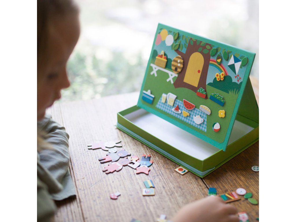 Dekorujte svůj zvířecí domeček nebo vytvořte roztomilý piknik pro zvířata v parku. Tento přenosný hrací set lze použít jako divadélko. Má dvě pozadí, z kterých si můžete vybrat, a také přes 72 magnetických dílků. Magnetickou scénku lze postavit díky zarážkám v krabici. Krabice ve stylu stojanu obsahuje elastickou gumičku, kterou můžete použít pro rychlý úklid. Kreativní hračka s nekonečnými možnostmi kombinací a scén. Pro děti od 3 let věku. Hlavní vlastnosti: 72 magnetických dílků 2 magnetické tabulkyPevná konstrukceZ recyklovaných materiálů potištěných rostlinnými inkoustySplňuje všechny bezpečnostní normy