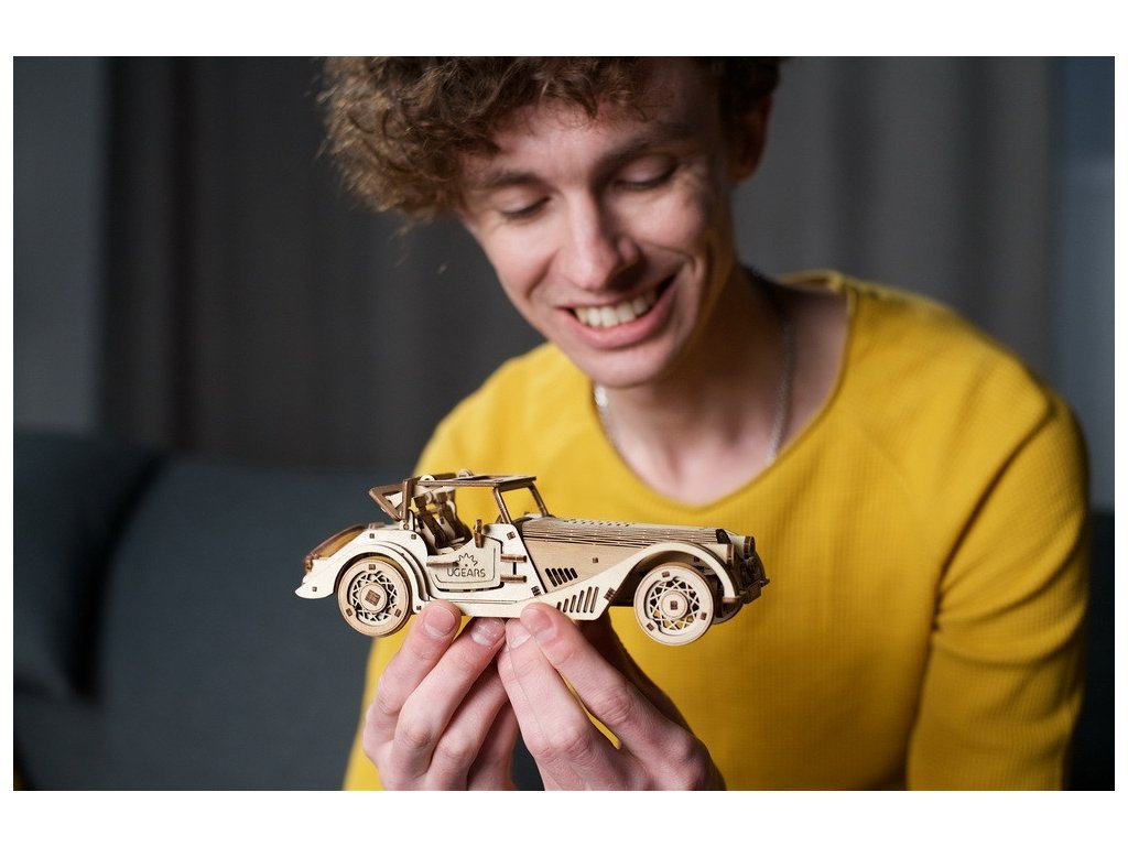 Představujeme Vám Sportovní auto Rapid Mouse - klasický roadster z poloviny 20. století. Model má funkci duálního motoru. Natočte pružinový motor šesti plnými otáčkami ráčnového klíče umístěného na podvozku modelu auta, nebo zatáhněte sportovní auto zpět po rovném povrchu, uvolněte jej a sledujte, jak se auto rozjíždí. Tento dřevěný model auta může zatáčet doleva nebo doprava nastavením předních kol nebo jej můžete nasměrovat rovně a jet kupředu. Gumové pneumatiky poskytují trakci a snadno se montují a vyměňují. Sportovní auto Rapid Mouse se vyznačuje nádherně propracovaným interiérem, funkčním rezervním kolem namontovaným v zavazadlovém prostoru, bočními dveřmi, které se otevírají, a manuální pevnou střechou se střešním oknem, které se vyklápí nahoru a dolů. Sada má 226 dílů a je na jednoduché obtížnosti sestavení. Vše, co potřebujete k sestavení, naleznete přímo v krabici. Jednoduše vyrazte kusy z předem nařezaných desek a poté je spojte dohromady podle našich ilustrovaných podrobných pokynů v 11 jazycích (angličtina, ukrajinština, němčina, španělština, francouzština, italština, portugalština, polština, japonština, čínština a korejština). Sportovní vůz je krásným doplňkem do našeho rostoucího katalogu závodních vozů, motorek, nákladních automobilů a dalších vynikajících automobilových modelů pro kutily. Skvělý dárek pro každého milovníka aut nebo nadšence do 3D puzzle! Můžete jej ponechat v jeho atraktivním stavu přírodního dřeva nebo žít své sny v malém měřítku tím, že jej natřete dle vlastního barevného schématu. Hlavní vlastnosti: 226 precizně vyřezaných dílkůjednoduchá obtížnost sestavenívýsledný model je řiditelný a schopný samostatné jízdynavrženo a vyrobeno na Ukrajině