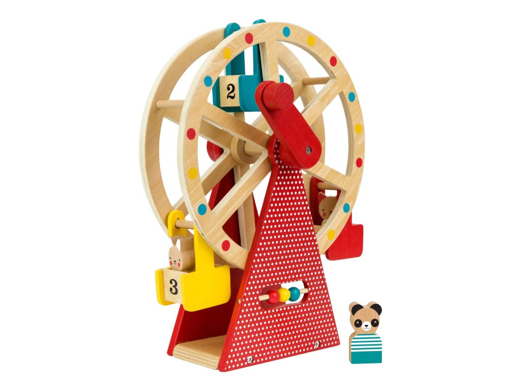 Vezměte své tři zvířecí přátele na projížďku na tomto krásně navrženém a stylovém dřevěném ruském kole. Otočte rukojeť a sledujte, jak se točí velké kolo! Použijte přiložené počítadlo například k počítání jízd. S rotujícím dřevěným ruským kolem se třemi vozíky a třemi zvířecími kamarády z bukového dřeva si užijete spoustu zábavy. Hlavní vlastnosti: Předem smontované a kvalitní dřevěné ruské kolo se otáčí pomocí kliky Obsahuje tři zvířecí kamarády z bukového dřeva Robustní dřevěná konstrukce kola je malována netoxickými barvami na vodní bázi Stylová hračka a krásný dekorační prvek v každém dětském pokoji Splňuje všechny bezpečnostní normy