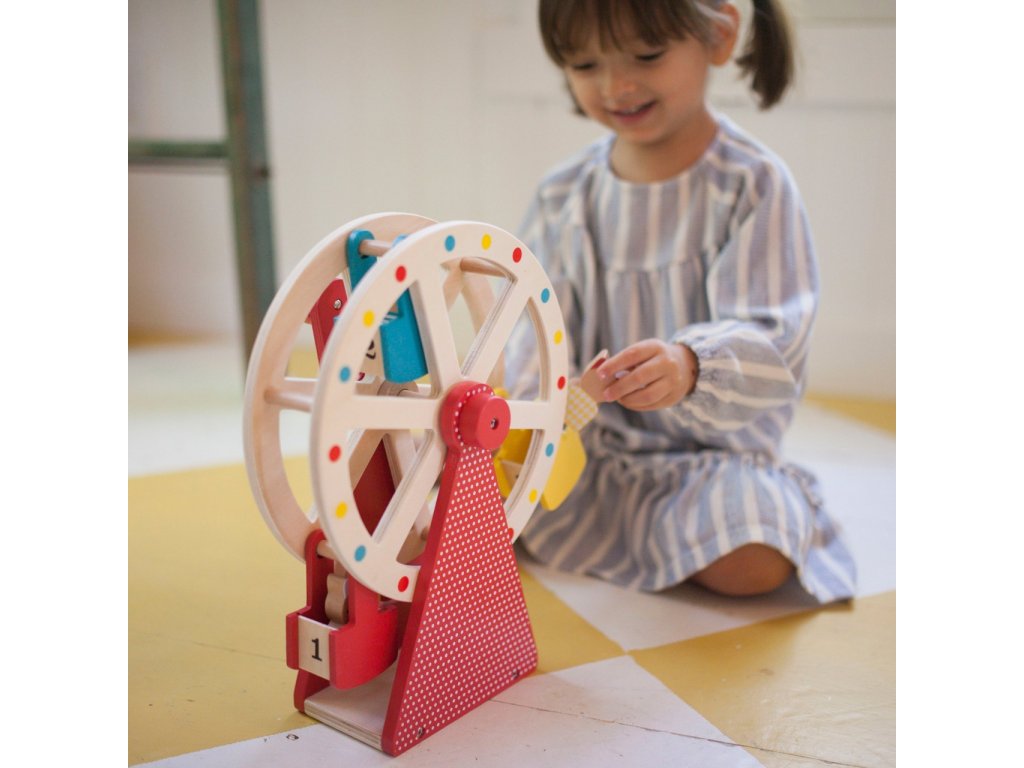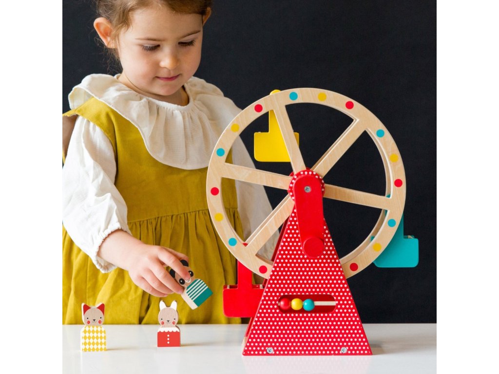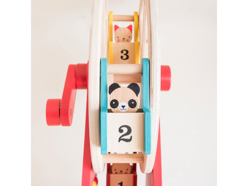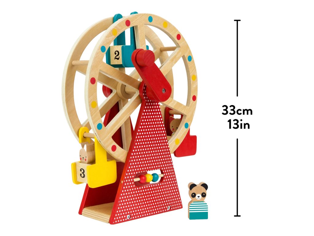 Vezměte své tři zvířecí přátele na projížďku na tomto krásně navrženém a stylovém dřevěném ruském kole. Otočte rukojeť a sledujte, jak se točí velké kolo! Použijte přiložené počítadlo například k počítání jízd. S rotujícím dřevěným ruským kolem se třemi vozíky a třemi zvířecími kamarády z bukového dřeva si užijete spoustu zábavy. Hlavní vlastnosti: Předem smontované a kvalitní dřevěné ruské kolo se otáčí pomocí kliky Obsahuje tři zvířecí kamarády z bukového dřeva Robustní dřevěná konstrukce kola je malována netoxickými barvami na vodní bázi Stylová hračka a krásný dekorační prvek v každém dětském pokoji Splňuje všechny bezpečnostní normy
