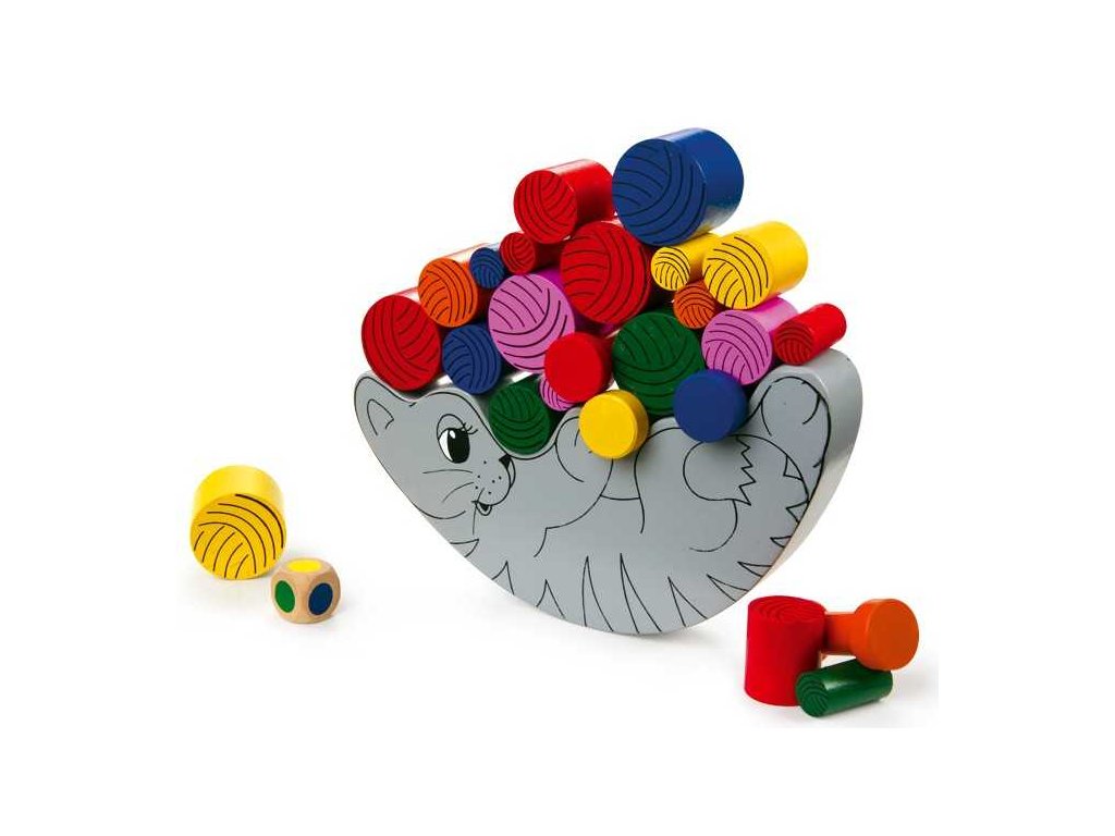 U této hry musíte dokázat, jak pevné máte nervy. Velké „klubka“ jsou vyrobeny z barevného masivního dřeva a jsou barveny barvami odolnými proti slinám. Čekají na hru s malou šedou kočičkou. Tato hra je vhodná také pro zlepšení manuální zručnosti dětí. Cílem hry je položit dřevěné klubíčka na kočku tak, aby zůstaly vyvážené na místě a nespadly. Přiložená barevná kostka říká hráčům, která barva by měla být položena na vyvažovací plochu jako další. Dřevěná hra, při které si děti procvičují jemnou motoriku, úsudek, logické myšlení a trpělivost. Příprava: Položte kočičku na rovnou plochu. 1 hráč: Hoď kostkou a příslušnou barvu polož na kočičku. Hoď kostkou znovu a umísti další barevný váleček. Ujisti se, že kočička drží rovnováhu a nespadne. Pokračuj ve hře do doby, než-li umístíš poslední váleček. Pokud ztratí kočička rovnováhu a válečky spadnou, začni od začátku. 2 až 4 hráči: V házení kostkou a umísťování válečků se střídejte. Hráč, jehož váleček spadne, je vyřazen ze hry. Ostatní pokračují ve hře. Hlavní vlastnosti: procvičuje jemnou motoriku, úsudek, logické myšlení a trpělivostodolné dřevěné provedení