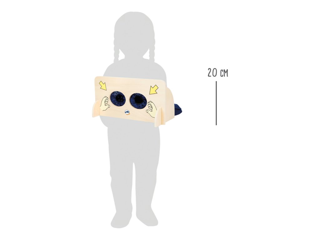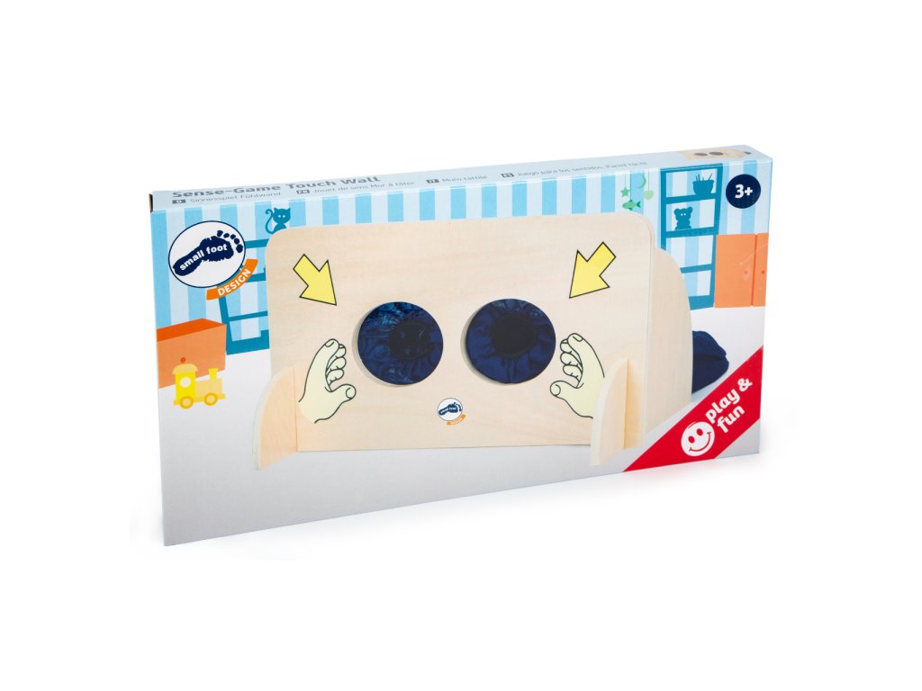 Různé předměty ukryjte do látkového pytlíku za dřevěnou stěnou. Pytlík je opatřen zipem, pro snadnější vkládání předmětů. Děti vloží ruce do textilních rukávů a podle hmatu se snaží rozpoznat, o jaký předmět se jedná. Hlavní vlastnosti: hra je vhodná také do školek nebo družinpomáhá rozvoji poznávacích a motorických dovedností