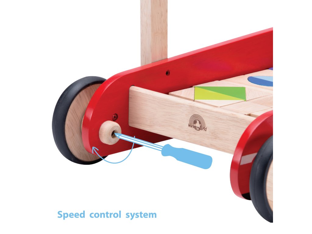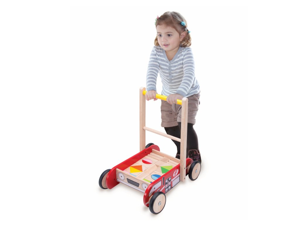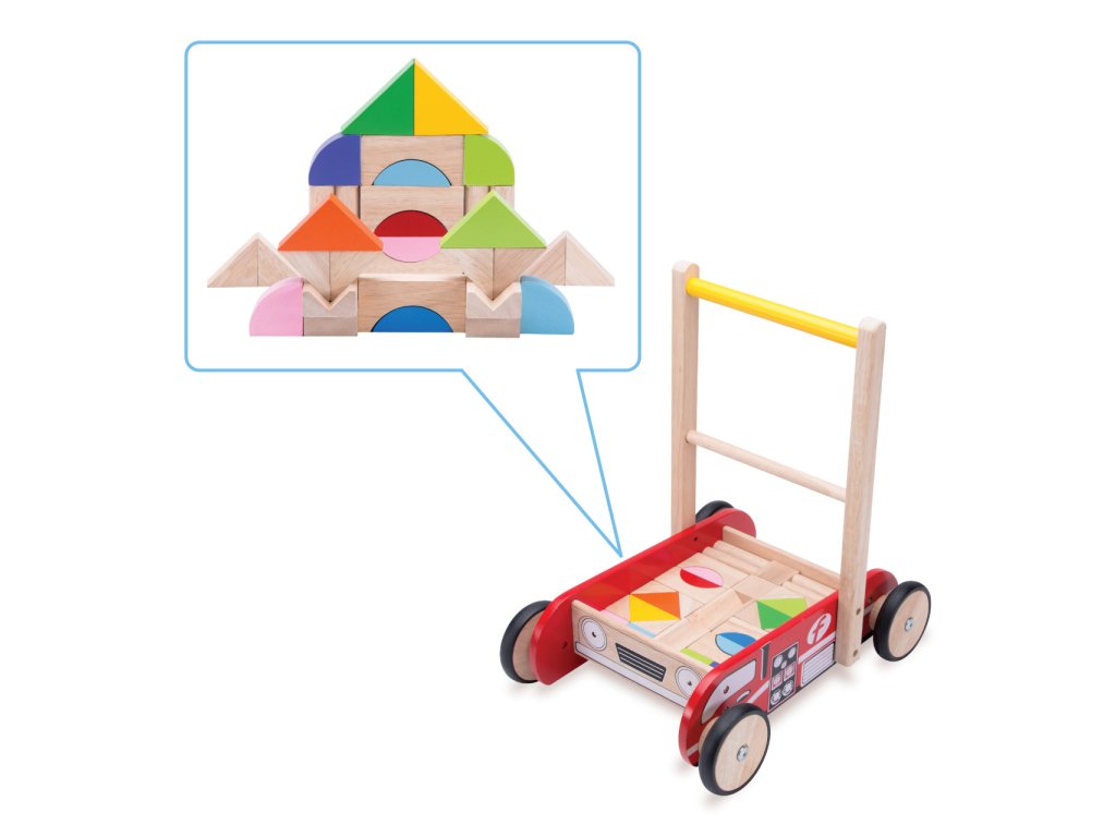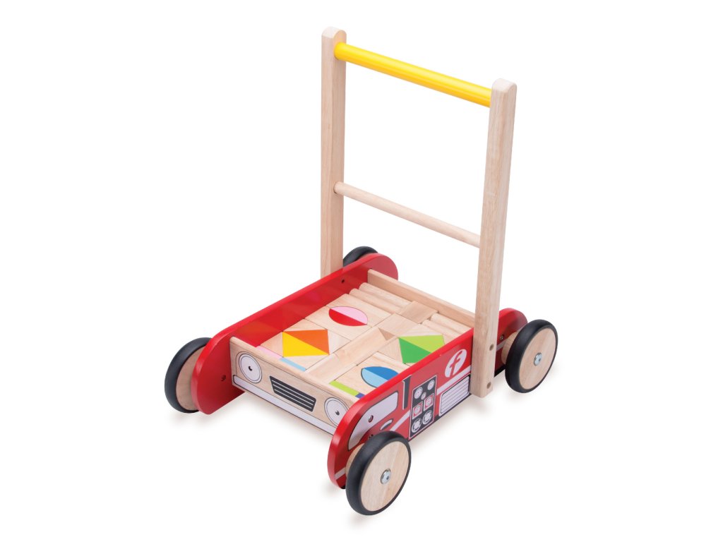 Chodítko v podobě hasičského vozu obsahuje sadu kostek převážně v barvě přírodního dřeva, přepravovat jím ale samozřejmě lze i jiné hračky. Snaha do něj kostky správně urovnat hru obohatí o zkoušku důvtipu. Je vybaveno praktickou brzdou, kterou můžete nastavit rychlost a oporu dítěti učícímu se chodit. Když už děti zvládají chůzi dobře, můžete kola odbrzdit, aby se dítě mohlo pohybovat svou rychlostí. Kola jsou opatřena gumovými návleky, které zaručují tichý chod na všech druzích povrchů. Chodítko se vyznačuje robustní, odolnou konstrukcí využívající překližku a masivní dřevo. Hlavní vlastnosti:chodítko, 12 různobarevných a 20 přírodních kostekbrzda pro oporu a cvičení chůzetichý chodrobustní dřevěné provedení