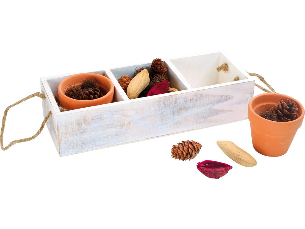 Sada přírodních materiálů určená k dotvoření. V balení podlouhlý dřevěný box s provázkovými madly, květináčky, šišky, sušené květy. Hlavní vlastnosti: materiál k vytváření dekorací barevnost dekorací odpovídá chladnějším měsícům roku