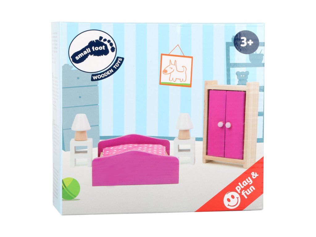 Tato 6dílná sada do ložnice má velikost pro ohýbací panenky do 12 cm. Je vyrobena z masivního dřeva pro dlouhou životnost. Hlavní vlastnosti: při hře tato sada probouzí fantazii a procvičuje jemnou motoriku