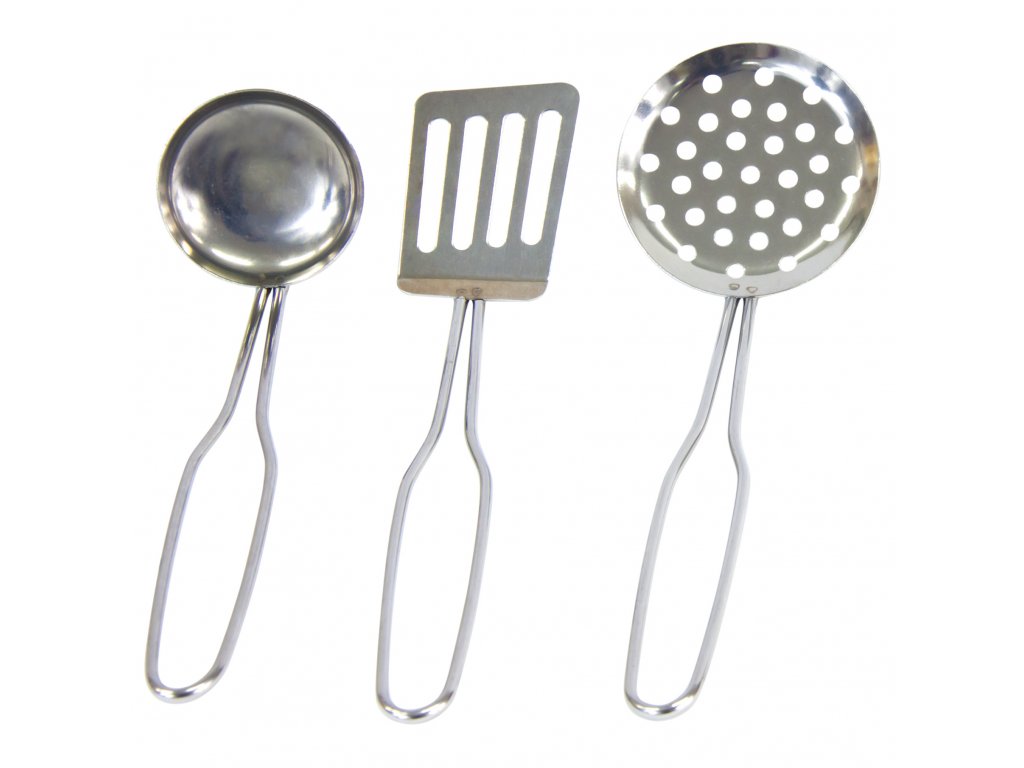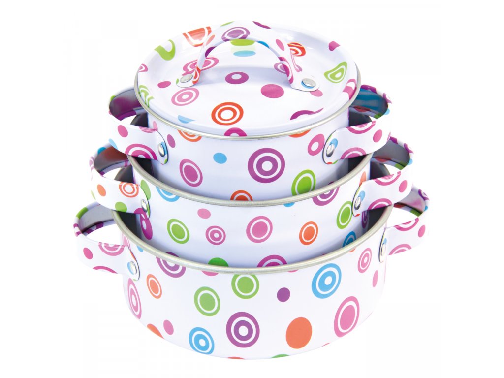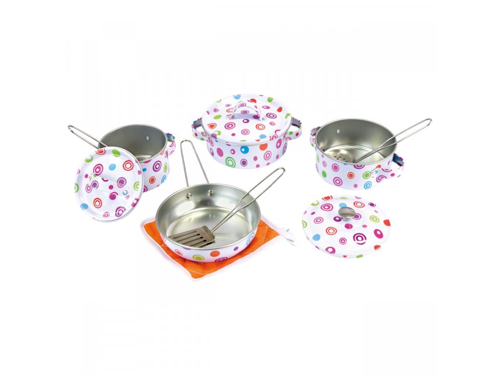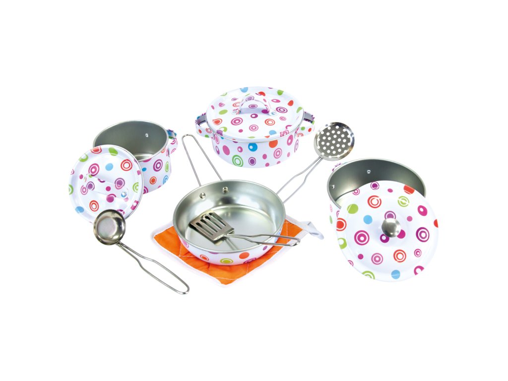 Sada kuchyňského nádobí a náčiní pro holčičky, ke hře na hospodyňku. Obsahuje hrnce s pokličkami, pánev, drobné kuchyňské náčiní i chňapku. Vhodné ke hrám uvnitř i venku. Hlavní vlastnosti:3 hrnce s poklicemi, pánev, naběračka, sítko, obracečka a chňapka