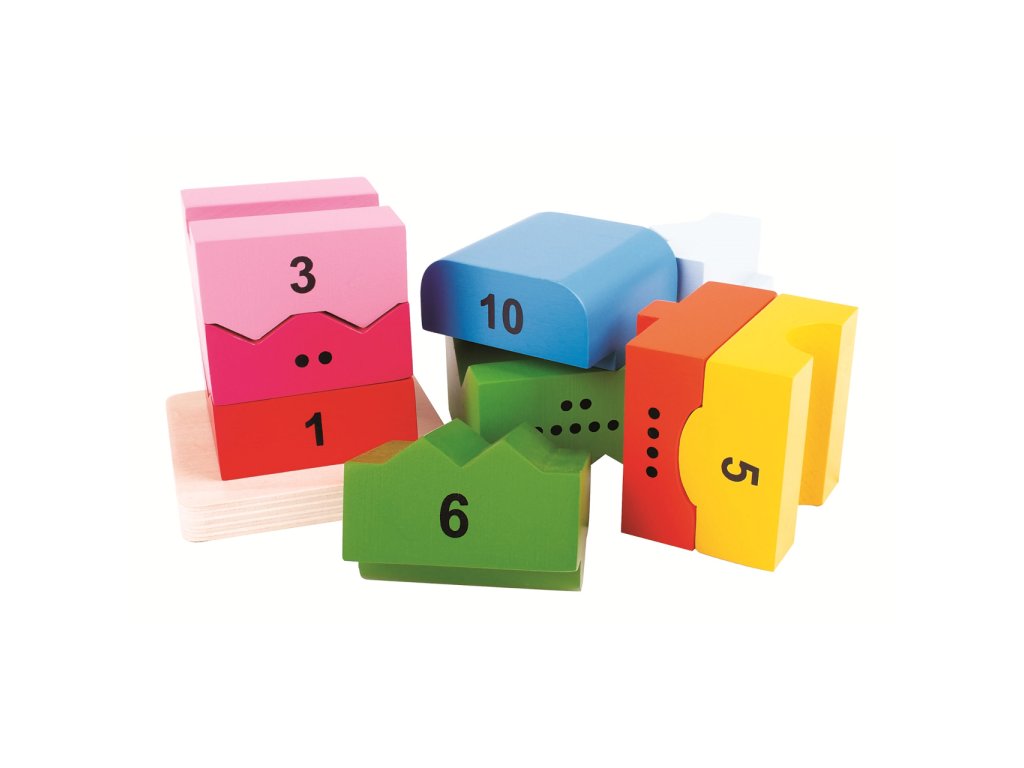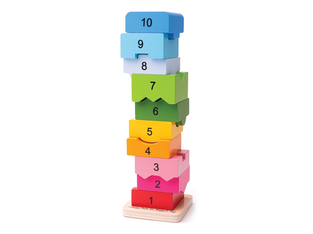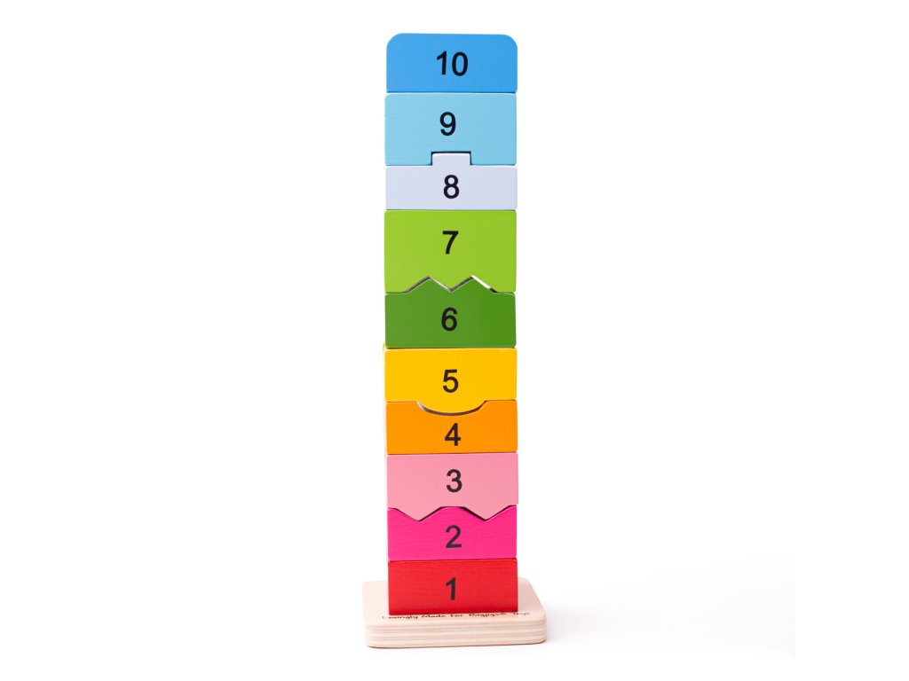 Stavěj věž a počítej bloky. Tak by se dala nazvat tato dřevěná očíslovaná věž v mnoha barvách, kde má každý barevný blok své číslo a vaše dítě se při jeho stavbě učí, jak napočítat od jedné do deseti. Jednotlivé bloky jsou skládačkového typu, dítě se tak učí dávat správné tvary k sobě. Každá jednotlivá kostka má specifický tvar, takže do sebe zapadají jen tak, jak jsou očíslovány. Bez středové tyče. Vyrobeno z vysoce kvalitních materiálů ze zodpovědných zdrojů. Vyhovuje současným evropským bezpečnostním normám. Obsahuje 11 dílů. Hlavní vlastnosti: procvičuje rozpoznávání čísel a počítáníobsahuje 11 dílůbloky jsou skládačkového typu, zapadají do sebe jen správné tvary