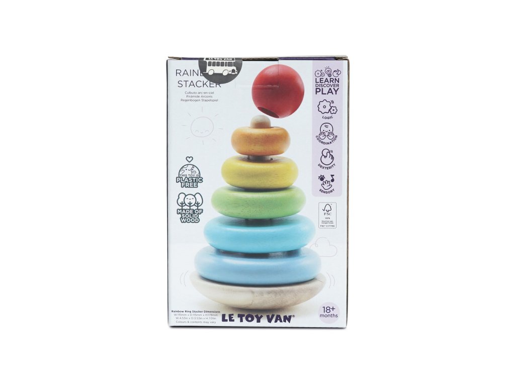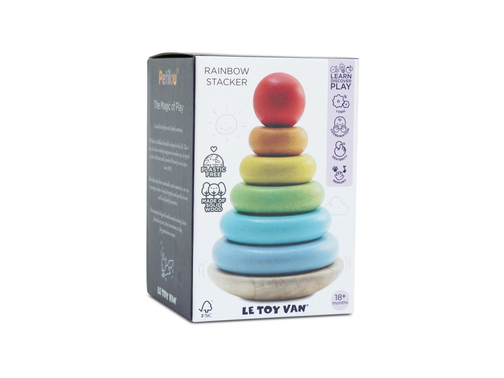 Dokážeš poskládat tuto duhu ve správném pořadí? Robustní barevné kroužky vybízí i ty nejmenší děti k jejich třídění. Trénuje se tak motorika, koordinace ruky a oka a chápání tvarů a velikostí. Houpající základna přidává na zábavě! Skládací věž je vyrobena ze dřeva s certifikací FSC® (dřevo z lesů obhospodařovaných udržitelným způsobem) a ozdobena barvami na vodní bázi bezpečnými pro děti. Hračky s účelemVšechny hračky firmy Le Toy Van jsou vyrobeny s cílem – aby dlouho vydržely. Designovány s láskou zkušenými řemeslníky za použití etických praktik a udržitelných materiálů, které jsou laskavější k naší planetě. Hlavní vlastnosti: vyrobeno eticky z udržitelného dřevatestováno dle nejpřísnějších standardůmalováno netoxickými barvami na bázi vody6 kroužků a kolíček se zaoblenou základnoutrénuje motoriku a koordinaci Ocenění hračky: Right Start Toy Award 2023 Petilou kolekce: Kolekce pro nemluvňata a batolata od Le Toy Van obsahuje hlavně hmatové hračky, které mají nejmenším posloužit také jako učební prostředky. Kolekce je inspirována přírodou kolem nás a je navržena tak, aby rozvíjela smysly dětí pomocí rozdílných zvuků, textur, tvarů a hmotností. Děti tak od malička zapojí všechny své smysly. V kolekci najdete například skládačky, vkládačky, chodítka, … Značka a certifikát FSC® (Forest Stewardship Council) zaručuje, že dřevo, ze kterého byl produkt vyroben, nebylo vytěženo nelegálně a pochází z lesů obhospodařovaných šetrným či přírodě blízkým způsobem, ve kterém jsou dodržovány přísné environmentální a sociální požadavky. Značka FSC® na výrobku znamená, že svým nákupem pomáháte chránit lesy a podporujete šetrné, odpovědné či přírodě blízké hospodaření, díky kterému jsou naše lesy stabilnější, zdravější, mají přirozenou druhovou skladbu a lépe odolávají negativním následkům klimatických změn.