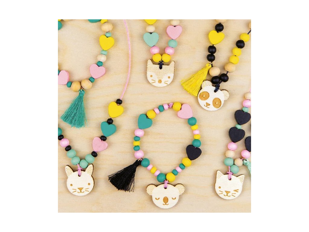 Souprava pro výrobů šperků dle vlastní fantazie obsahuje velké množství dřevěných korálků, odzdob a přívěsků, také ale šňůrky a bezpečnou navlékací jehlu. Sada je spolu s návodem k použití balena v praktickém plechovém kufříku vybaveném uchem. Hlavní vlastnosti: 120 korálků, 25 srdíček, 5 střapců, 5 přívěšků, 2 šňůrky a navlékací jehlapraktické balení