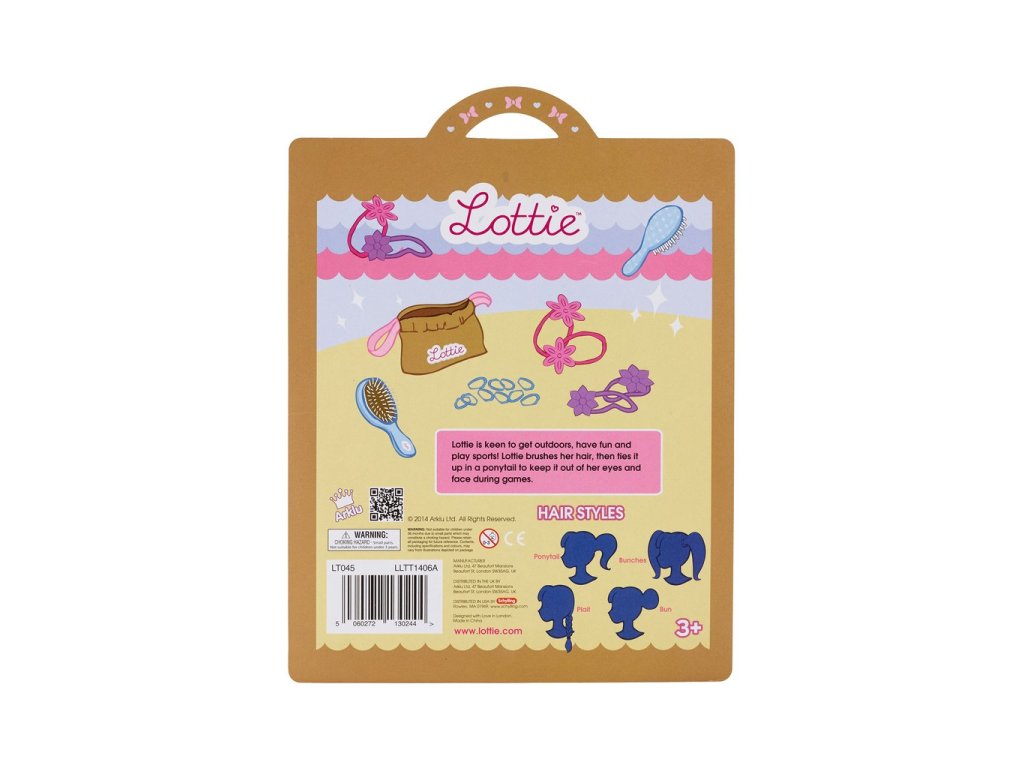 Lottie Hřeben na vlasy s doplňky Díky krásnému barevnému boxu (s rukojetí k jednoduchému přenosu) nepotřebuje tato sada žádný další obal. Doplňky a panenky Lottie byly navrženy v Irsku a také vyhrály ocenění za panenku s mnoha detaily, což je důležitého pro každého sběratele. Panenka Lottie není součástí balení. Hlavní vlastnosti Kartáč na vlasyManšestrový pytlík se stahovací šňůrkou2 růžové gumičky s kytičkou2 fialové gumičky s kytičkou10 modrých elastických gumiček Lottie ráda chodí ven, hraje si, sportuje. Učeše si vlasy a poté je stáhne gumičkou do culíku, aby jí během hry nepadaly do obličeje.