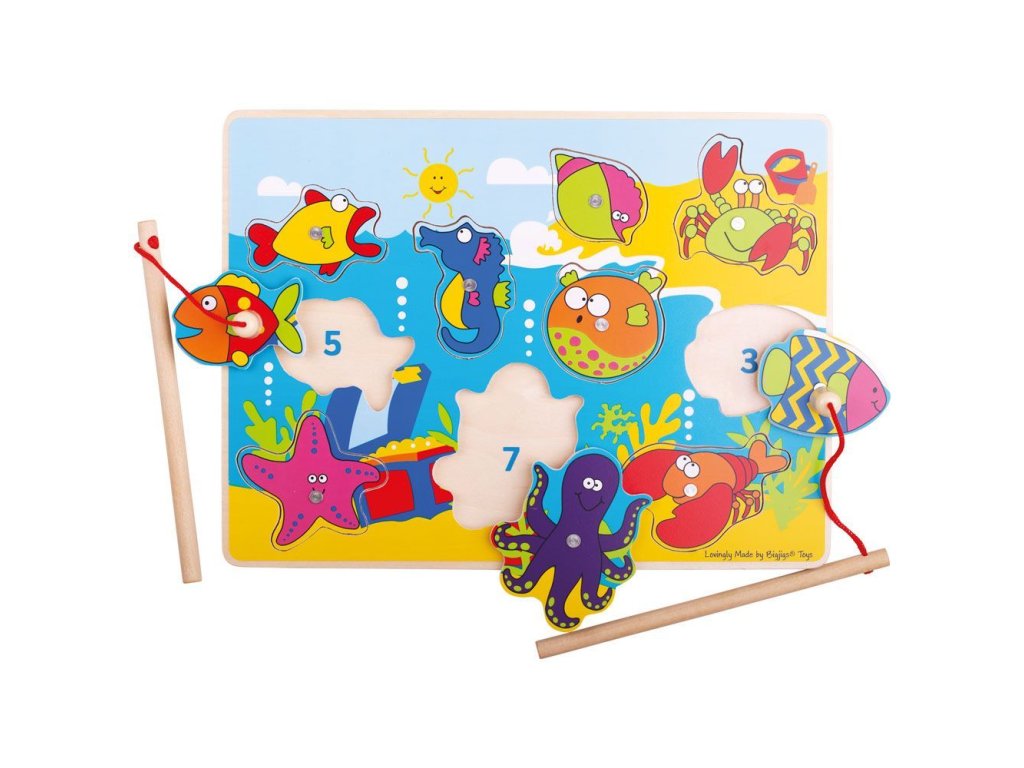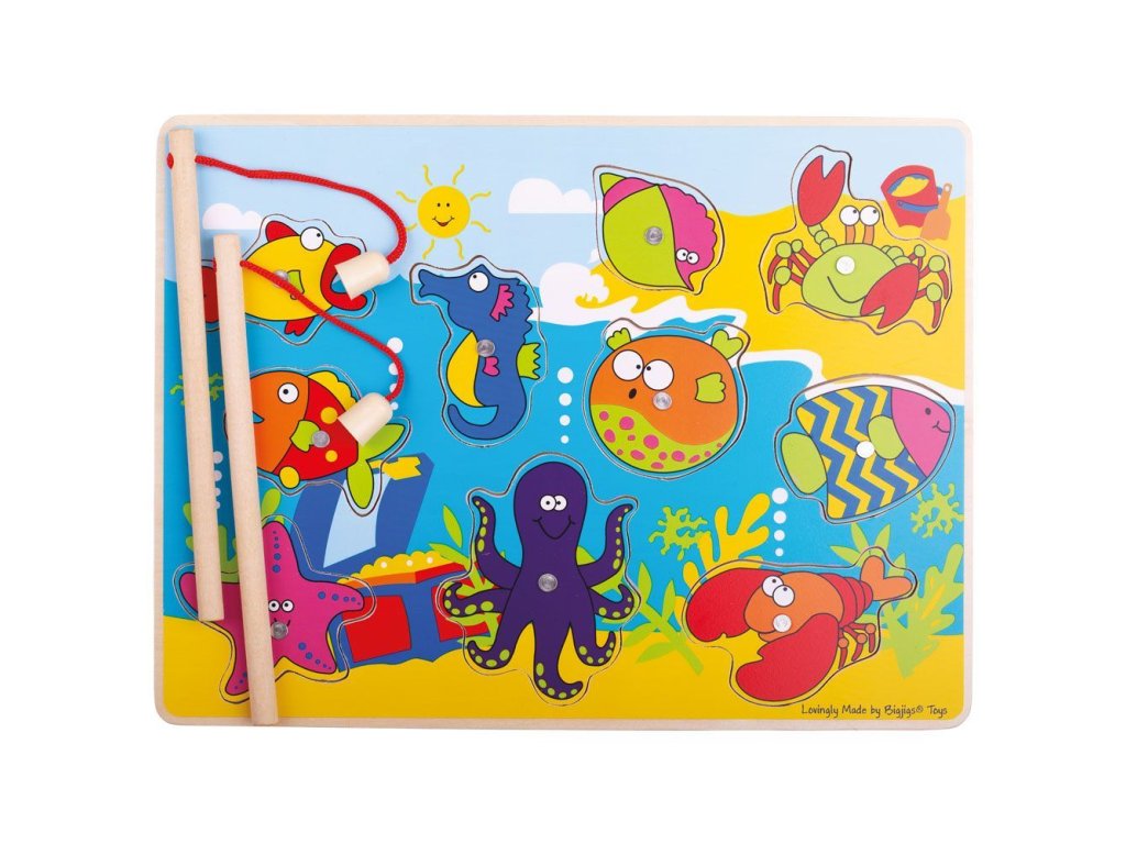 Nadějní rybáři a rybářky mohou vylovit 10 mořských živočichů a to díky 2 magnetickým prutům. Při lovu počítají své body a hráč, který chytí nejvíce ryb vyhrává. Poté se musí všechny dílky vrátit na své místo, hra je tedy zároveň i puzzle! Skvělá příležitost, jak děti naučit o podmořském světě. Podpoří děti v brzkém počítání, rozvíjí koordinaci ruka-oko, motoriku a zručnost. Obsahuje 2 magnetické dřevěné pruty, 10 magnetů živočichů. Vyrobeno z kvalitních materiálů z odpovědných zdrojů. Odpovídá evropské bezpečnostní normě. Hlavní vlastnosti: hra na rybaření a puzzleobsahuje 13 dílůrozvíjí koordinaci ruka-oko, motoriku a zručnost