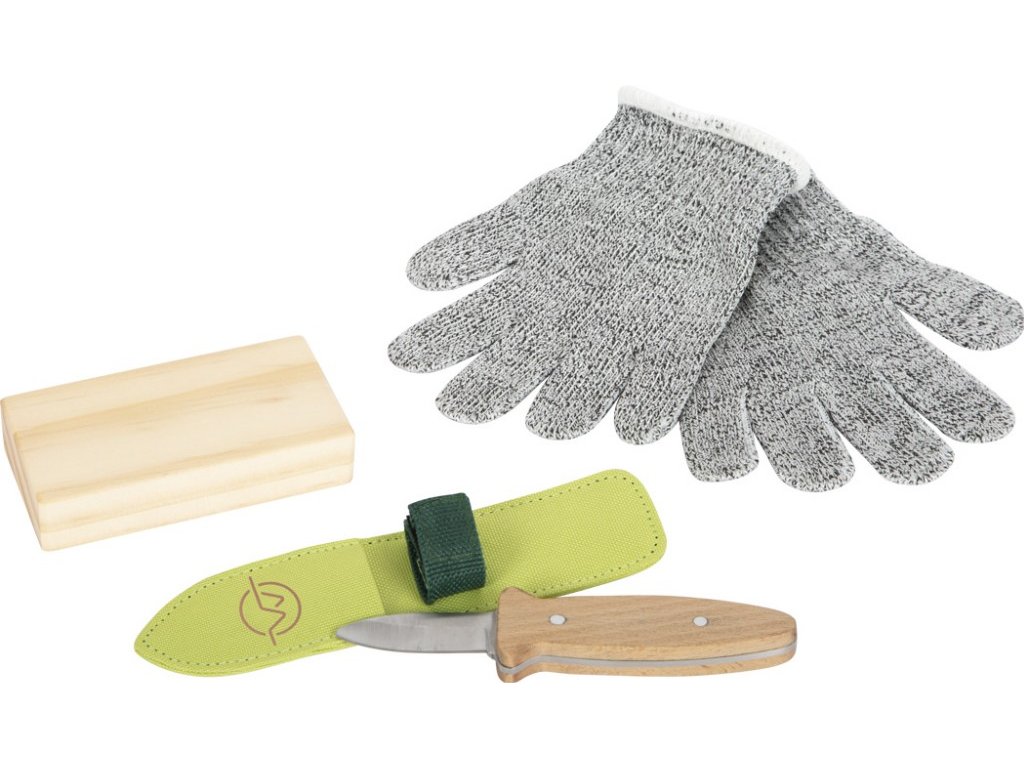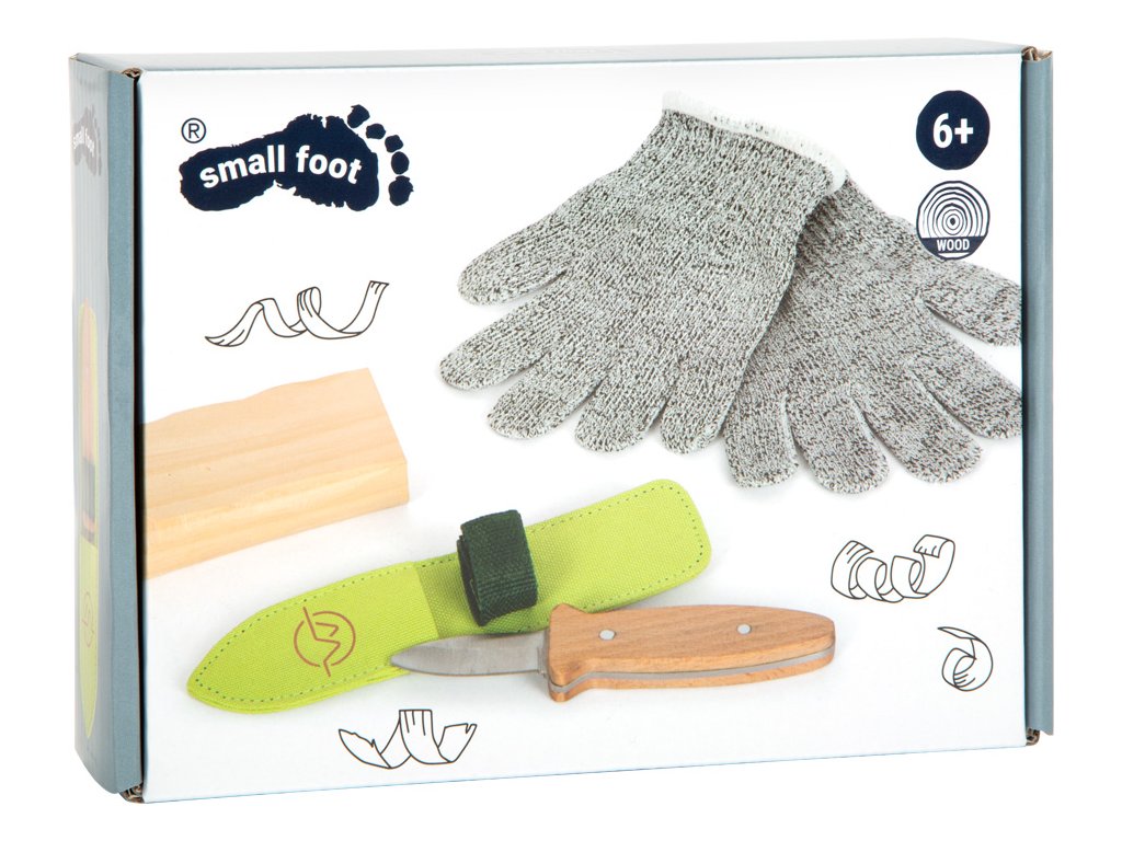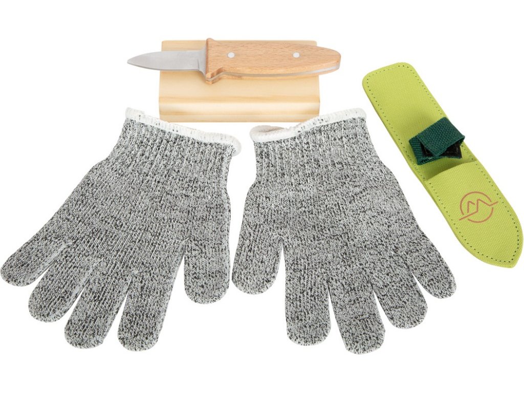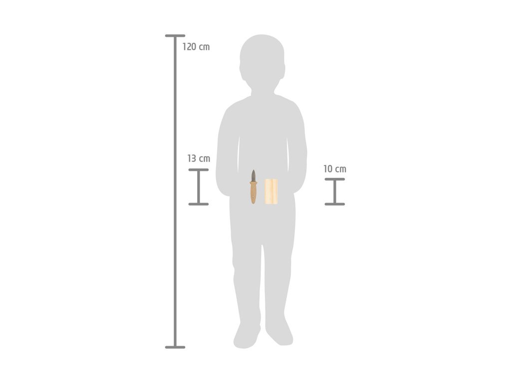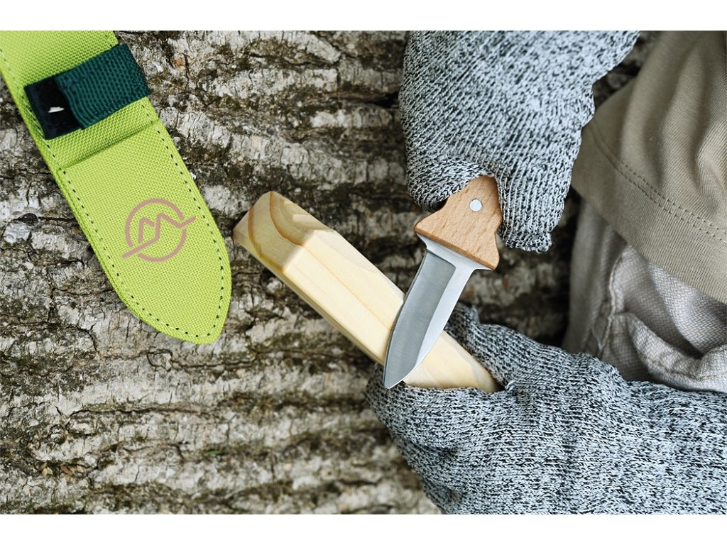 Chceš štípat klacíky, krájet ovoce nebo si připravit klacek na opékání? S outdoorovým dětským nožem to není žádný problém! Díky krátké, robustní čepeli s tupou špičkou, kompaktním rozměrům a dřevěné rukojeti dokonale tvarované pro dětské ruce mohou děti získat první zkušenosti s vyřezáváním a manipulací s nožem. Nůž je bezpečně uložen v látkovém pouzdře s háčky a poutky pro připevnění k opasku. Sadu doplňuje pár speciálních rukavic odolných proti pořezání a dřevěný řezací špalíček. Čepel tohoto outdoorového nože je ostrá, protože tupé čepele nejsou v žádném případě bezpečnější než ostré! Při řezání tupým nožem musíte použít mnohem více síly, což zvyšuje riziko vyklouznutí nože a zranění. Dětské nože na vyřezávání by samozřejmě měly být i tak vždy používány pod dohledem dospělých a v rámci pevně stanovených pravidel. Nože nejsou hračky, ale nástroje! Jsou ideální pro výlety do přírody, dobrodružství a expedice - protože s dětským outdoorovým a průzkumným vybavením se svět za dveřmi stane vzrušujícím místem plným dobrodružství! Hlavní vlastnosti: obsahuje 5 kskrátká, robustní čepel (jednostranně broušená) a tupá špička noževybavení vhodné zejména do přírody a na průzkum