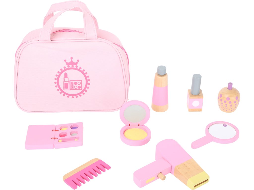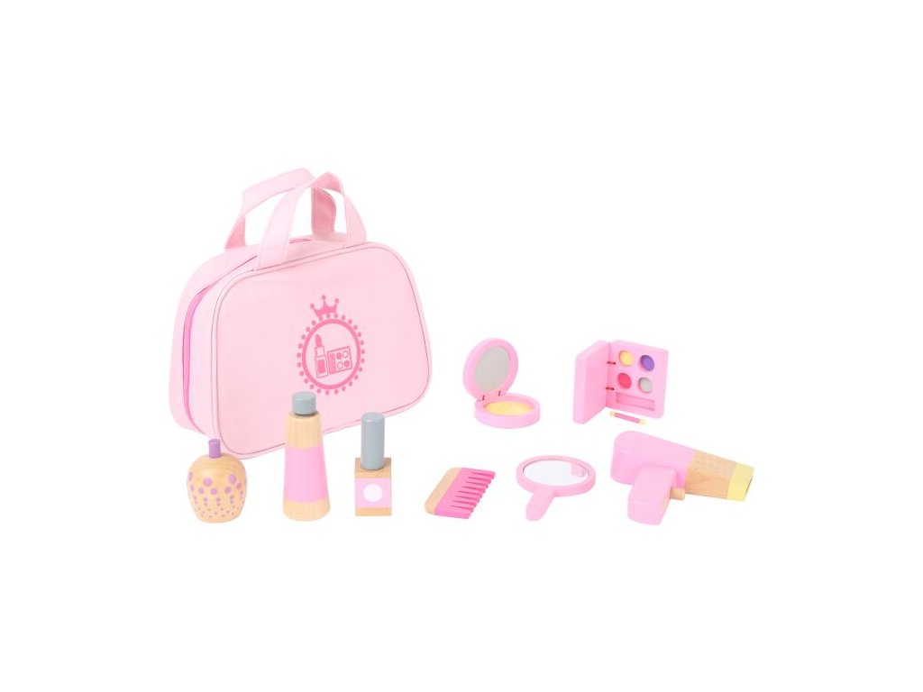 Zrcadlo, zrcadlo, kdo je nejkrásnější… v tomto dětském pokoji? Soutěž krásy může začít s touto roztomilou kosmetickou taštičkou plnou růžových dřevěných doplňků. Fén, hřeben, lak na nehty i voňavka, pudr i oční stíny jsou tím, co by mladá parádnice měla mít. Lahvičky z lakovaného dřeva se úhledně vejdou do přenosné tašky. Hlavní vlastnosti: obsahuje taštičku a 8 ks příslušenstvírozvíjí hraní rolí