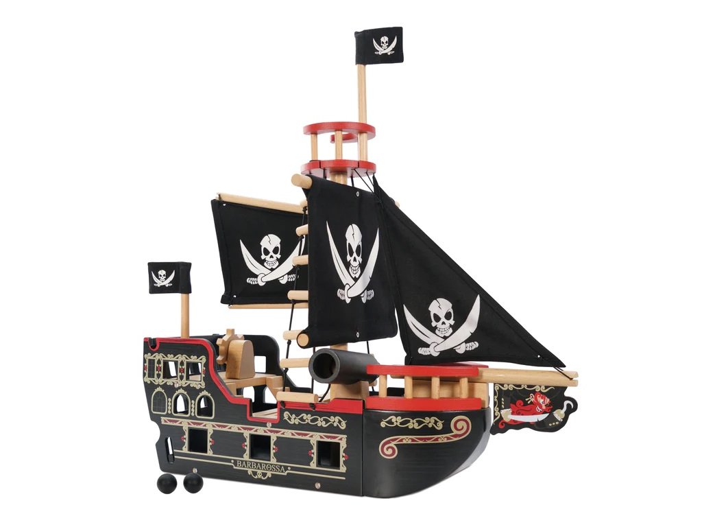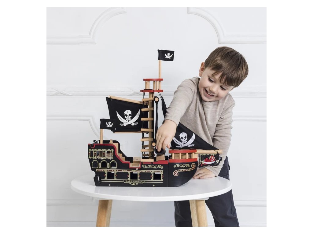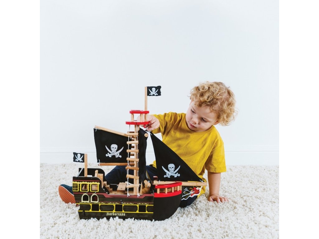 Velkolepá Barbarossa je připravena k plavbě! Loď je malována černou barvou, její černé plachty s lebkou a překříženými meči varují, piráti se plaví! Krásná hračka s mnoha detaily je vyrobena z odolného a udržitelného dřeva. Je plná interaktivních funkcí, které děti mohou objevovat během představivé hry – vraní hnízdo, popravčí prkno, lanoví, dělo s koulemi (střílí díky pružiny), kotva s navijákem, dveře do podpalubí a otevírací záď. Hračka bez obsahu plastu je vhodná pro figurky do 10 cm. Hračky s účelemVšechny hračky firmy Le Toy Van jsou vyrobeny s cílem – aby dlouho vydržely. Designovány s láskou zkušenými řemeslníky za použití etických praktik a udržitelných materiálů, které jsou laskavější k naší planetě. Hlavní vlastnosti: vyrobeno eticky z udržitelného dřevatestováno dle nejpřísnějších standardůmalováno netoxickými barvami na bázi vodyinspiruje k představivé hřerozvíjí kognitivní dovednosti Ocenění hračky:Right Start Best Toy Award Pirátská kolekce: Tradiční pirátská kolekce pro nejmenší s balanční pirátskou lodí, ale také pro větší děti s lodí Barbarrossa, která vyhrála ocenění. Design vytažený do detailu, hračky podporují v představivé hře. S hračkami i postavičkami si děti užijí dlouhé hodiny zábavy. Značka a certifikát FSC® (Forest Stewardship Council) zaručuje, že dřevo, ze kterého byl produkt vyroben, nebylo vytěženo nelegálně a pochází z lesů obhospodařovaných šetrným či přírodě blízkým způsobem, ve kterém jsou dodržovány přísné environmentální a sociální požadavky. Značka FSC® na výrobku znamená, že svým nákupem pomáháte chránit lesy a podporujete šetrné, odpovědné či přírodě blízké hospodaření, díky kterému jsou naše lesy stabilnější, zdravější, mají přirozenou druhovou skladbu a lépe odolávají negativním následkům klimatických změn.