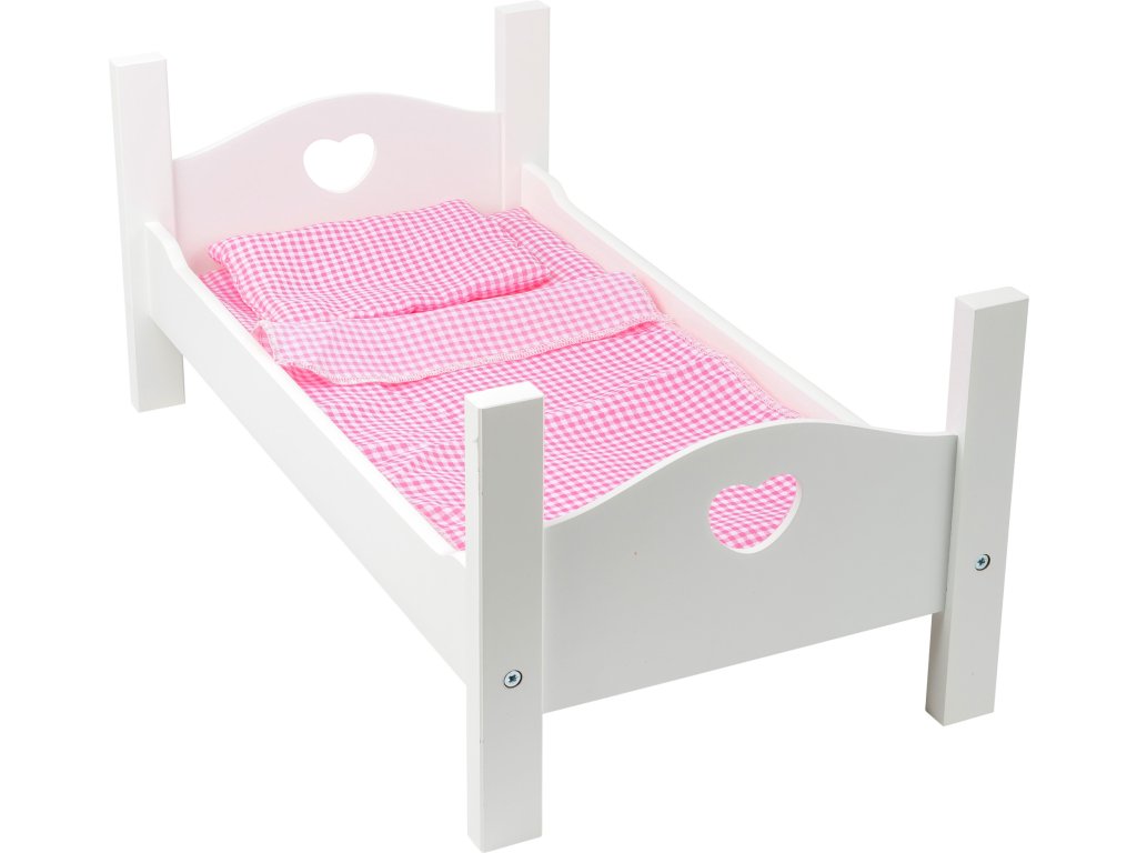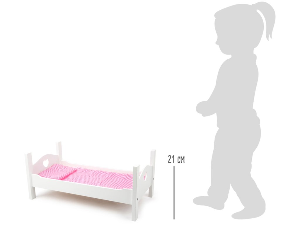 V téhle postýlce se panence či plyšákovi bude spát sladce! Moderní dřevěná postýlka v bílé barvě s detaily srdíček v čelech. Součástí balení je polštář, deka a prostěradlo. Ideální doplněk k sadě nábytku pro panenky. Hlavní vlastnosti: pro panenky do velikosti 45 cmvčetně ložního prádla