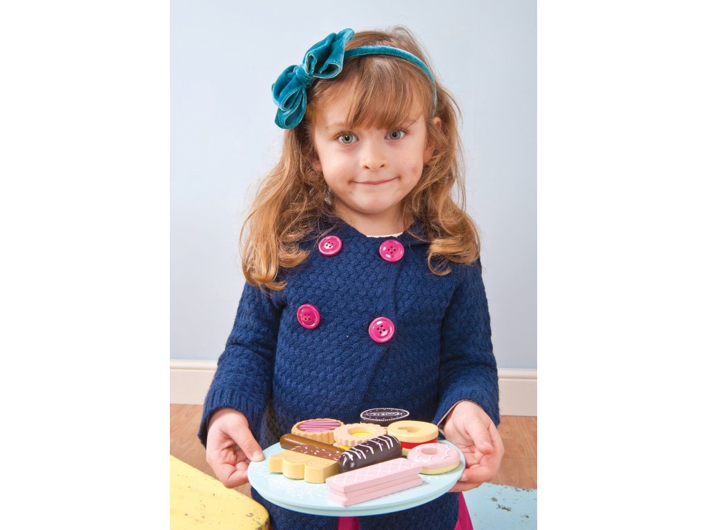 Kdo si dá sušenku? Na výběr je 9 domácích sušenek, které jsou samozřejmě ze dřeva. Mají rozdílné tvary i ilustrace. Sušenky jsou servírovány na dekorovaném talíři. Perfektní hračka pro čajové dýchánky i jinou představivou hru. Malováno netoxickými barvami na bázi vody. Hračky s účelemVšechny hračky firmy Le Toy Van jsou vyrobeny s cílem – aby dlouho vydržely. Designovány s láskou zkušenými řemeslníky za použití etických praktik a udržitelných materiálů, které jsou laskavější k naší planetě. Hlavní vlastnosti: vyrobeno eticky z udržitelného dřevatestováno dle nejpřísnějších standardůmalováno netoxickými barvami na bázi vodyinspiruje k představivé hřerozvíjí kognitivní dovednosti Honeybake kolekce: Hračky v této kolekci jsou vhodné k objevování, pomohou dětem s rozvojem představivosti, sociálních a verbálních dovedností a kognitivních funkcí. Tradiční design s moderními detaily děti jistě bude bavit. Honeybake je kolekce Le Toy Van, která vyhrála nejvíce ocenění, a to za design, kvalitu, bezpečnost a také za vzdělávací a herní hodnotu.