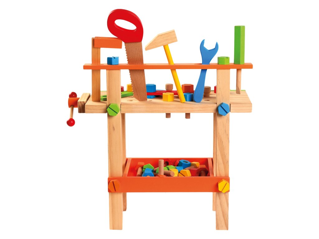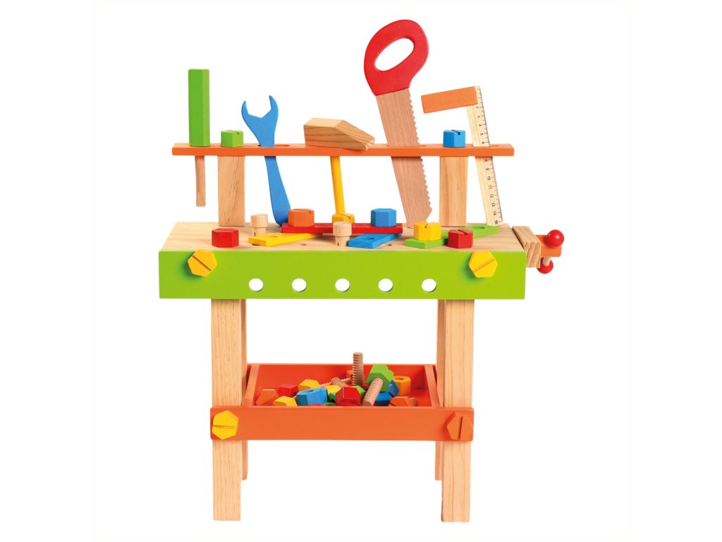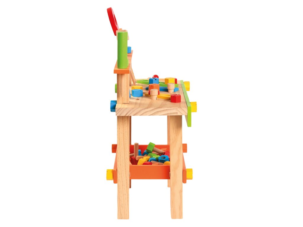 Souprava určená všem malým kutilům. Obsahuje robustní pracovní stůl s děrovanou pracovní deskou, svěrákem, úložnými prostory, nářadím a barevnými doplňkovými díly stavebnice. S její pomocí může Váš malý řemeslník rozvíjet svou představivost a jemnou motoriku. Souprava nabízí robustní a odolné provedení, díly jsou vyrobeny ze silné překližky a masivního dřeva. Hlavní vlastnosti: 9 dílný stůl se svěrákem, 5 dílů nářadí a 36 stavebnicových dílůrobustní dřevěné provedení