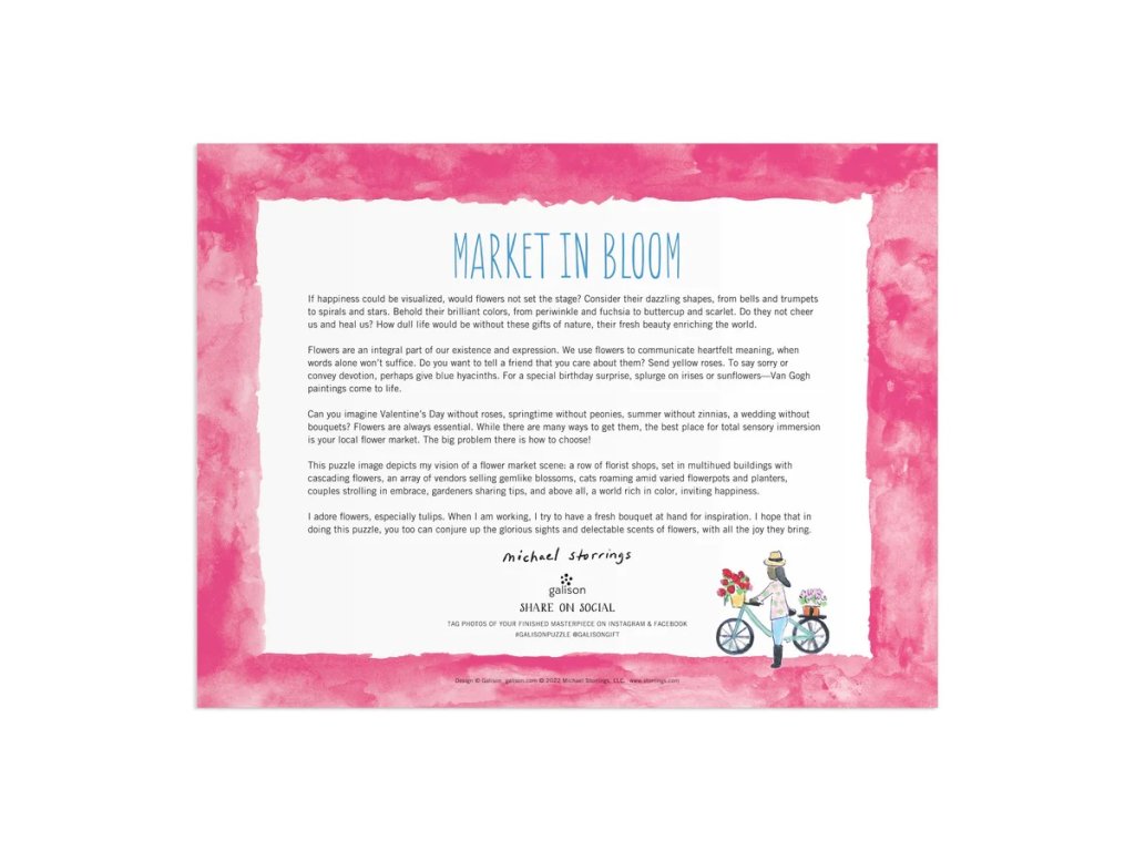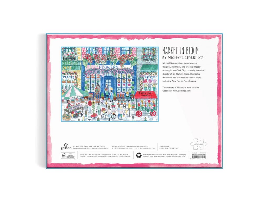 Oceněný designér, ilustrátor Michael Storrings nádherně ilustroval slunečný den na trhu s květinami. Puzzle je baleno v pevné krabici, pro opětovné použití a skladování. Ideální jako dárek. Autorem obrázku je Michael Storrings. Puzzle jsou vyrobeny za použití významného podílu recyklovaného papíru a nabízí špičkový potisk nezávadnými barvami. Jsou opatřeny matnou povrchovou úpravou, která zajišťuje za všech okolností věrné podání detailů i barev. Jejich zadní strana je potažena hladkým, na dotek příjemným povrchem, díky němuž se při skladování rozloženého puzzle netvoří prach. Spolu s pečlivě zabalenými dílky naleznete v balení také letáček s návodným obrázkem, který zpravidla obsahuje další informace o tvůrcích a pozadí vzniku díla. Dodáváno v mimořádně pevné a poutavě zpracované kartonové krabičce vyrobené z recyklovaného kartonu a udržitelně získaných materiálů s certifikací FSC®. Hlavní vlastnosti: 2000 precizně vyřezaných dílkůvyrobeno s použitím recyklovaných a udržitelně získaných materiálůpečlivě vybraný motiv od renomovaných tvůrců a umělcůpotisk a provedení nejvyšší kvalityobsahuje návodný obrázek