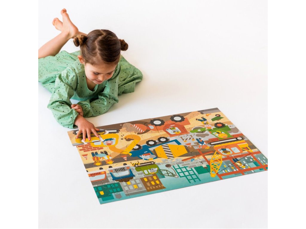 Velké 24-dílné podlahové puzzle pro malé děti Stavba ve městě s motivem stavby a stavebních strojů jako je bagr, jeřáb, domíchávač... Puzzle je detailně a krásně ilustrované. Baleno v kufříku s měkkým bavlněným lanem. Vhodné pro děti od 3 let. Hlavní vlastnosti: V praktické krabici je uloženo 24 dílkůRozměr: 61x46cmPuzzle je vyrobeno z recyklovaného kartonu a tištěno s rostlinnými inkoustySplňuje všechny požadavky na bezpečnost hraček