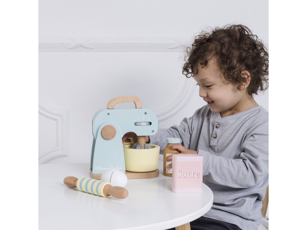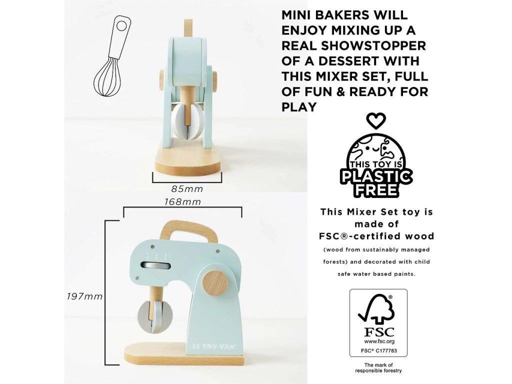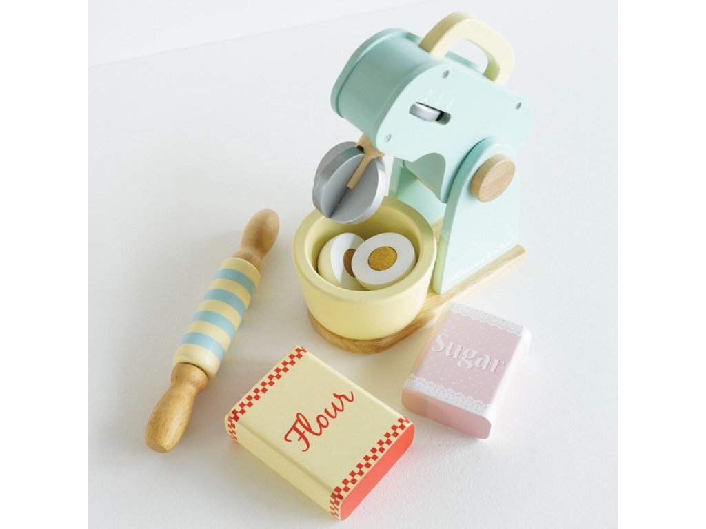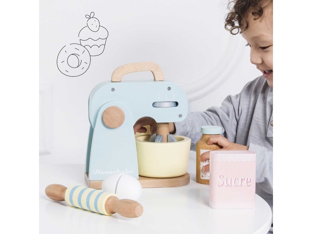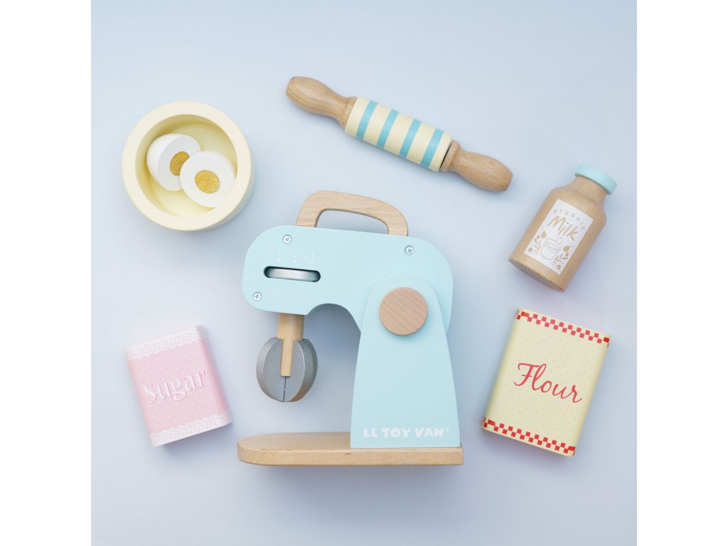 Co upečou malí pekaři a pekařky? Kuchyňský robot s příslušenstvím je připraven k představivé hře! V balení otočná metlička, dřevěný váleček a mísa. Tato krásná retro hračka je malována pastelovými barvami, nechybí ani ingredience k jejímu použití – mouka, cukr, mléko a vejce. Děti mohou „upéct“ dort, sušenky nebo buchtu ve vlastní dětské kuchyňce! Hračky s účelemVšechny hračky firmy Le Toy Van jsou vyrobeny s cílem – aby dlouho vydržely. Designovány s láskou zkušenými řemeslníky za použití etických praktik a udržitelných materiálů, které jsou laskavější k naší planetě. Hlavní vlastnosti: vyrobeno eticky z udržitelného dřevatestováno dle nejpřísnějších standardůmalováno netoxickými barvami na bázi vodyinspiruje k představivé hřerozvíjí kognitivní dovednosti Ocenění hračky:Loved By Children Gold Award 2017 Honeybake kolekce: Hračky v této kolekci jsou vhodné k objevování, pomohou dětem s rozvojem představivosti, sociálních a verbálních dovedností a kognitivních funkcí. Tradiční design s moderními detaily děti jistě bude bavit. Honeybake je kolekce Le Toy Van, která vyhrála nejvíce ocenění, a to za design, kvalitu, bezpečnost a také za vzdělávací a herní hodnotu. Značka a certifikát FSC® (Forest Stewardship Council) zaručuje, že dřevo, ze kterého byl produkt vyroben, nebylo vytěženo nelegálně a pochází z lesů obhospodařovaných šetrným či přírodě blízkým způsobem, ve kterém jsou dodržovány přísné environmentální a sociální požadavky. Značka FSC® na výrobku znamená, že svým nákupem pomáháte chránit lesy a podporujete šetrné, odpovědné či přírodě blízké hospodaření, díky kterému jsou naše lesy stabilnější, zdravější, mají přirozenou druhovou skladbu a lépe odolávají negativním následkům klimatických změn.