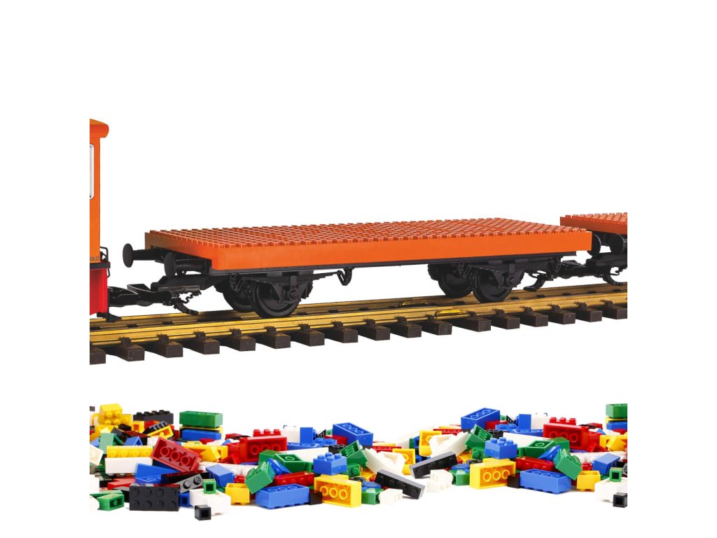 Video je pouze ilustrační, zobrazuje příbuzný produkt. Stavějte a přestavujte vagóny podle vlastní fantazie! Startovací sada obsahuje základní okruh spolu se soupravou nákladního vlaku, která se skládá z dieselové lokomotivy GE a dvojice dvounápravových plošinových vozů s úpravou pro kostky rozšířených plastových stavebnic. Lokomotiva je ovládána bezdrátově pomocí kapesního dálkového ovladače a je nezávisle, bateriově napájená. Vysokou životnost zajišťují chromovaná dvojkolí, kuličková ložiska a voděodolné pouzdro pohonného ústrojí. Soupravu je tak možno provozovat i v exteriéru. Balení obsahuje hůlku k rozpojení spřáhel, odpojování a připojování vozů. Vyrobeno v Německu, v souladu s nejpřísnějšími standardy kvality. Nákup sady je vhodné doplnit o příslušný spotřební materiál. Plocha základny: 130x130 cmMinimální konstrukční plocha: 150x150 cm Hlavní vlastnosti:bezdrátové analogové ovládánínezávislé napájení bateriemi (6×AAA baterie nejsou součástí balení)široce kompatibilní s plastovými stavebnicemi mnoha výrobcůdvojice nápravvhodné i do exteriéruvyrobeno v Německu Tato sada obsahuje:bateriově napájená dieselová lokomotiva GE (1 ks) plošinový stavebnicový vagón – 37970 (2 ks) kolej oblouková G-R1 – 35211 (12 ks) balení 14 ks kolejových spojek – 35285 (1 ks) hůlka k rozpojení spřáhel – 36039 (1 ks) Dokumentace:brožura ke stavebnicovým vagónům (DE)návod k obsluze a seznam náhradních dílů soupravy č. 37155 (DE, EN, FR, NL)