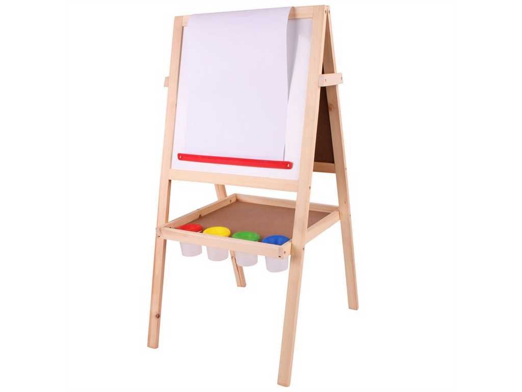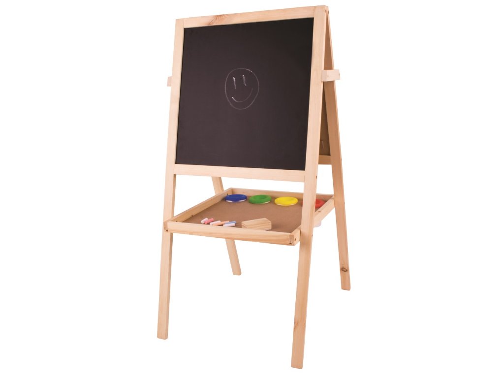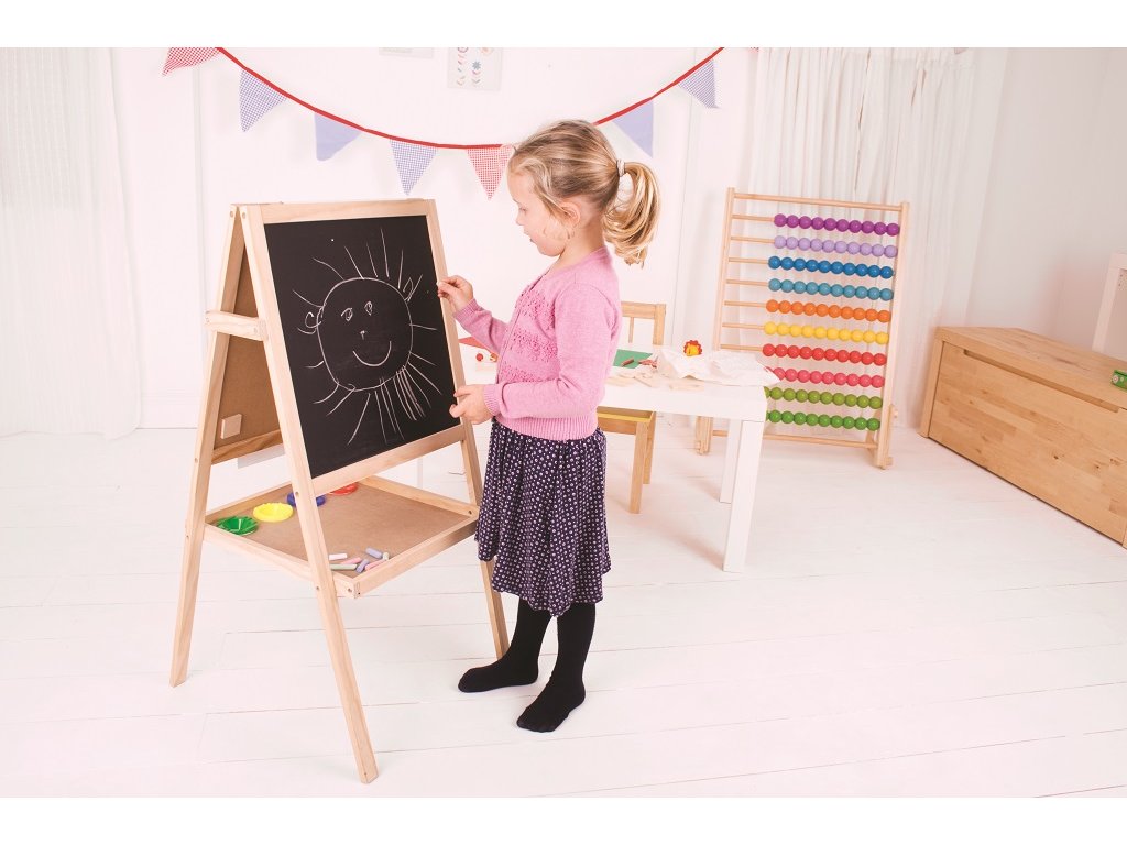 S touto všestrannou tabulí lze snadno rozvíjet kreativní umělecké dovednosti dětí. Z jedné strany magnetická tabule se suchým stíráním fixů, z druhé strany tradiční tabule pro křídu. Součástí je role papíru, kterou lze snadno upevnit na tyč skrytou mezi tabulemi v jejich horní části, dále čtyři nádobky na barvy, guma a 12 barevných kříd. Hlavní vlastnosti: včetně příslušenstvívyrobeno z kvalitních zodpovědně nakupovaných materiálůvyhovuje současným evropským bezpečnostním normám