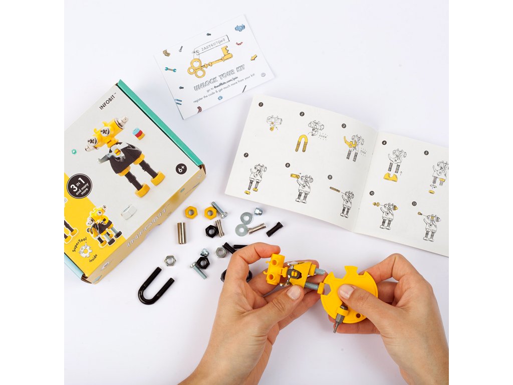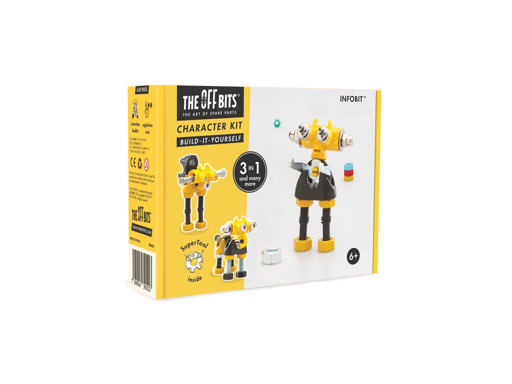 Seznamte se s InfoBitem, zvědavým čtenářem, který se rád učí. Tento robot se sortimentem barevných matic, šroubů a tvarovaných dílů je encyklopedií znalostí. Popusťte uzdu své fantazii. Tato sada umožňuje vytvoření tří modelů s dalšími nekonečnými možnostmi pro vaše vlastní kreativní nápady. Jedná se o hračku, která pomáhá mladým lidem růst v oblastech vědy, technologie, inženýrství, umění a matematiky. Hračky OffBits také podporují rozvoj jemné motoriky, prostorové představivosti, řešení problémů a nápadité hry. Co můžete postavit:Robota infoBit, kuřátkoBit nebo štěněBit plus nekonečné množství jedinečných výtvorů, které můžete postavit pomocí své fantazie. Máte kolem sebe karton, šroubky nebo jiné zábavné materiály? Vylepšujte s předměty každodenní potřeby a vytvořte také své vlastní jedinečné vynálezy. Hlavní vlastnosti: obsahuje nářadí pro sestavení stavebnicekompatibilnost s každodenními předmětyrozvoj kreativity, jemné motoriky i logického myšlenívhodné od šesti let3 v 1návod je součástí