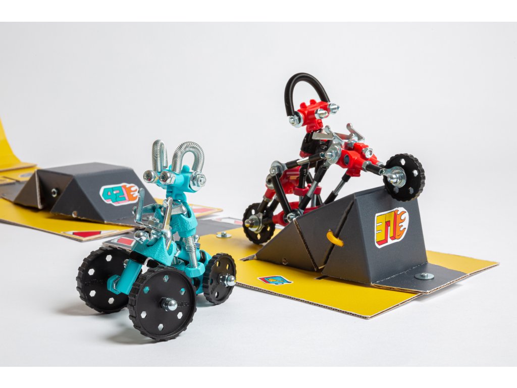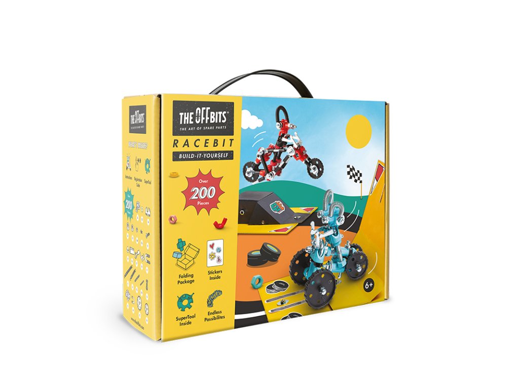 Je čas zařadit rychlost a odstartovat závod. Přeměňte kartonovou krabici OffBits na závodní dráhu s rampou a sestavte závodní týmy z matic a šroubů. Sestav CharlieBit a jeho červenou motorku CrossBit a pak JumperBit s jeho parádním modrým ScooterBitem. Nechte je mezi sebou závodit a vyzkoušejte, jak vysoko dokáží přeskočit rampu nebo kdo udělá nejhustší triky. Sada obsahuje více než 200 barevných matic, šroubů, tvarovaných kousků, samolepek a naše víceúčelové balení s nulovým odpadem, které se promění v součást herního zážitku a stane se závodní dráhou. Popusťte uzdu své fantazii. Tato sada umožňuje vytvoření čtyř modelů s dalšími nekonečnými možnostmi pro vaše vlastní kreativní nápady. Jedná se o hračku, která pomáhá mladým lidem růst v oblastech vědy, technologie, inženýrství, umění a matematiky. Hračky OffBits také podporují rozvoj jemné motoriky, prostorové představivosti, řešení problémů a nápadité hry. Co můžete postavit:CharlieBit a jeho červenou motorku CrossBit, JumperBit s jeho parádním modrým ScooterBitem plus nekonečné množství jedinečných výtvorů, které můžete postavit pomocí své fantazie. Máte kolem sebe karton, šroubky nebo jiné zábavné materiály? Vylepšujte s předměty každodenní potřeby a vytvořte také své vlastní jedinečné vynálezy. Hlavní vlastnosti: obsahuje nářadí pro sestavení stavebnicekompatibilnost s každodenními předmětyrozvoj kreativity, jemné motoriky i logického myšlenívhodné od šesti letvíce než 200 dílůobal je součástí herního zážitku