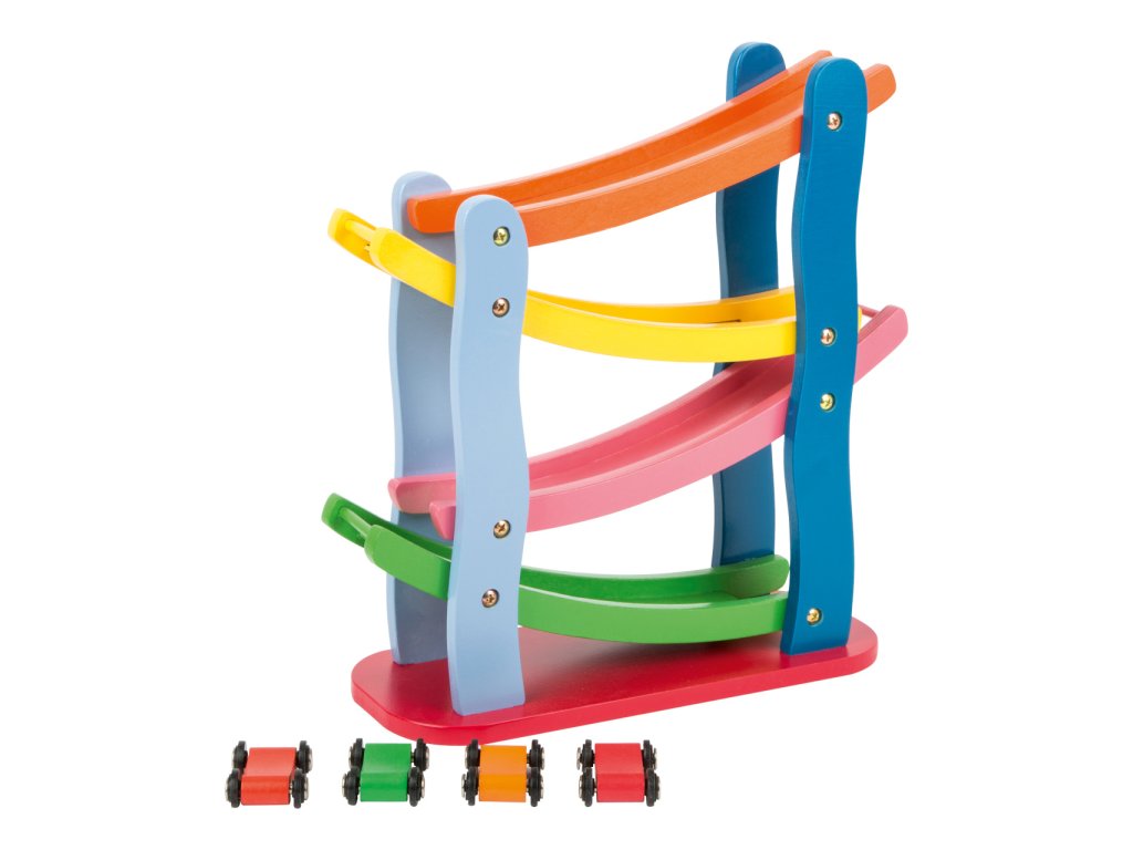 Tato závodní dráha z barevného dřeva je „Formulí 1“ mezi kaskádovými dráhami. Čtyři malá barevná auta uhánějí po stabilní dřevěné závodní dráze a přitom dělají kotrmelce. Dřevěná auta se snadno drží a jsou připravena na další rychlý sjezd.Hit pro všechny děti, které mají rády rychlá auta! Hlavní vlastnosti: zábava na dlouhé hodinyrozvíjí motoriku a učí rozpoznávat barvy4 ideálně velká autíčka v balení