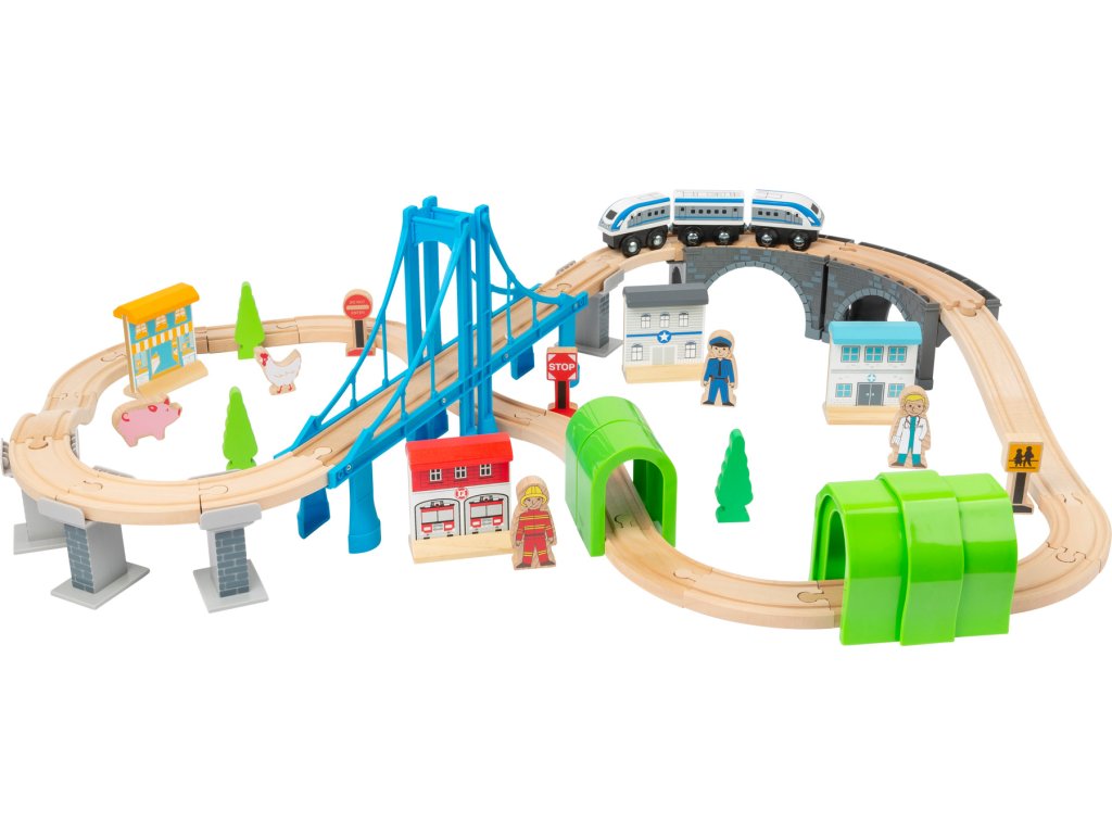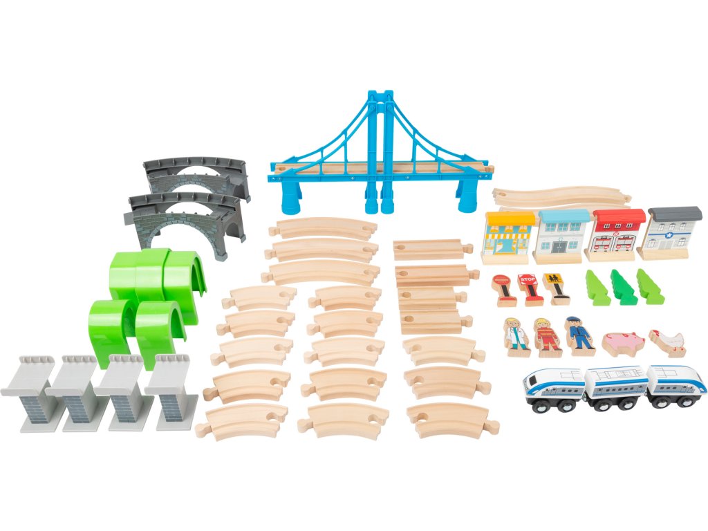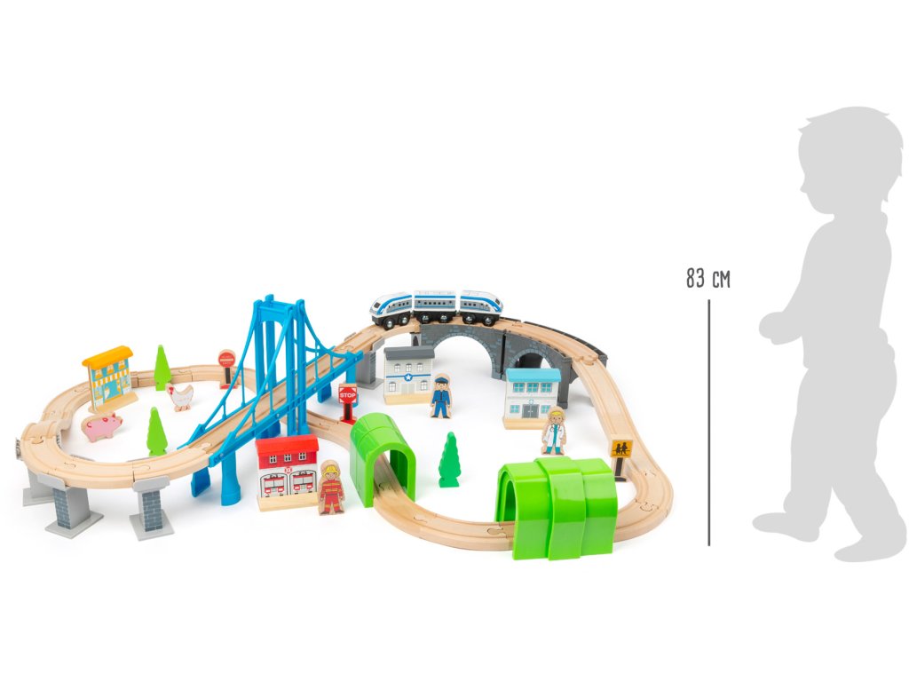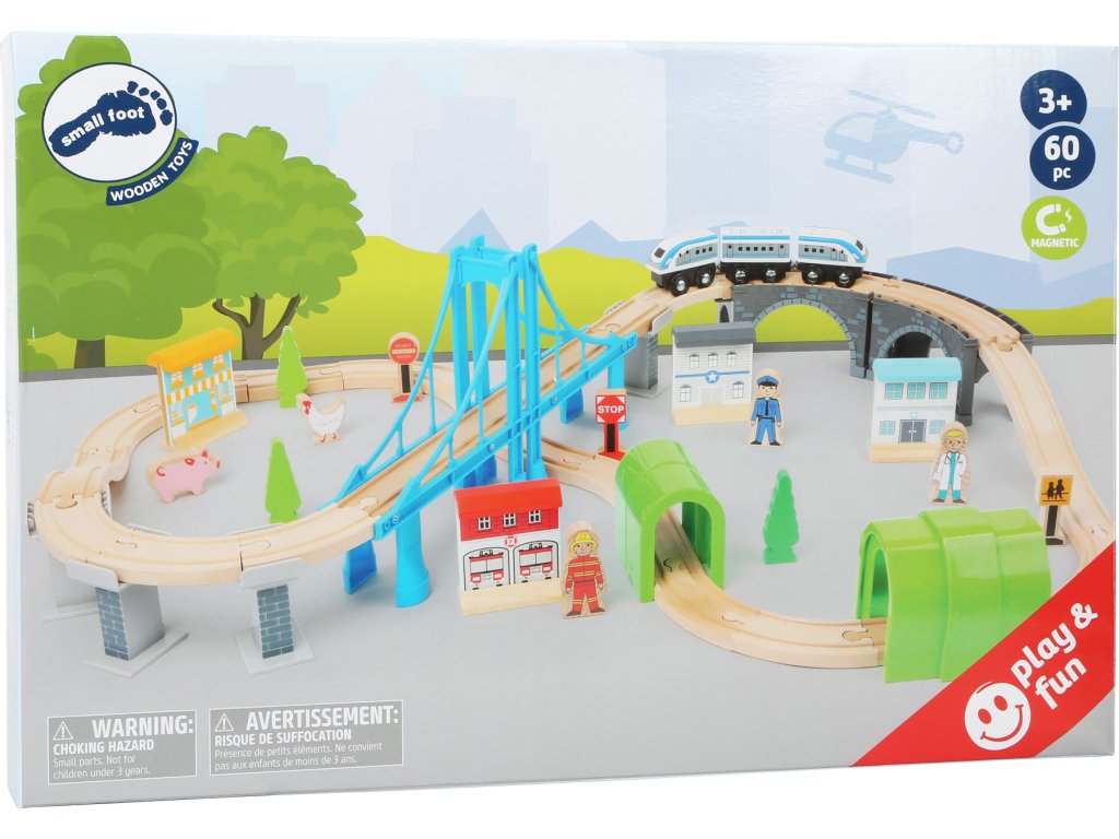 Objevte svět železnice! Díky dřevěné vláčkodráze s mosty se děti mohou ponořit do dechberoucího miniaturního světa. Zde vlakový expres jezdí přes visutý most nebo projíždí tunely. Vláčkodráha obsahuje 60 dílů. Hlavní vlastnosti: obsahuje 60 dílůpodporuje představivost, obratnost a koordinaci